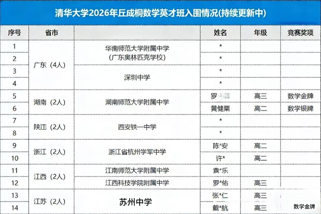 清华数学英才班(14人),他们分别来自湖南、广东、陕西、浙江、江西、江苏等省份。