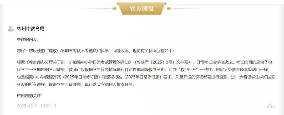 值得注意的是,政策落实仍存在区域差异。新化县枫林街道中心学校的家长告诉记者,“一开始群里通知六年级语数全县抽考,后来又说四年级也要全科目抽考,孩子学习压力骤增。”对此,该校回应称,根据教育部相关文件,义务教育3—9年级每学期可组织一次期末考试,本次期末考试全街道统一时间、统一制卷,旨在监测、研判各学校相关年级的教学情况,不做跨校评价。