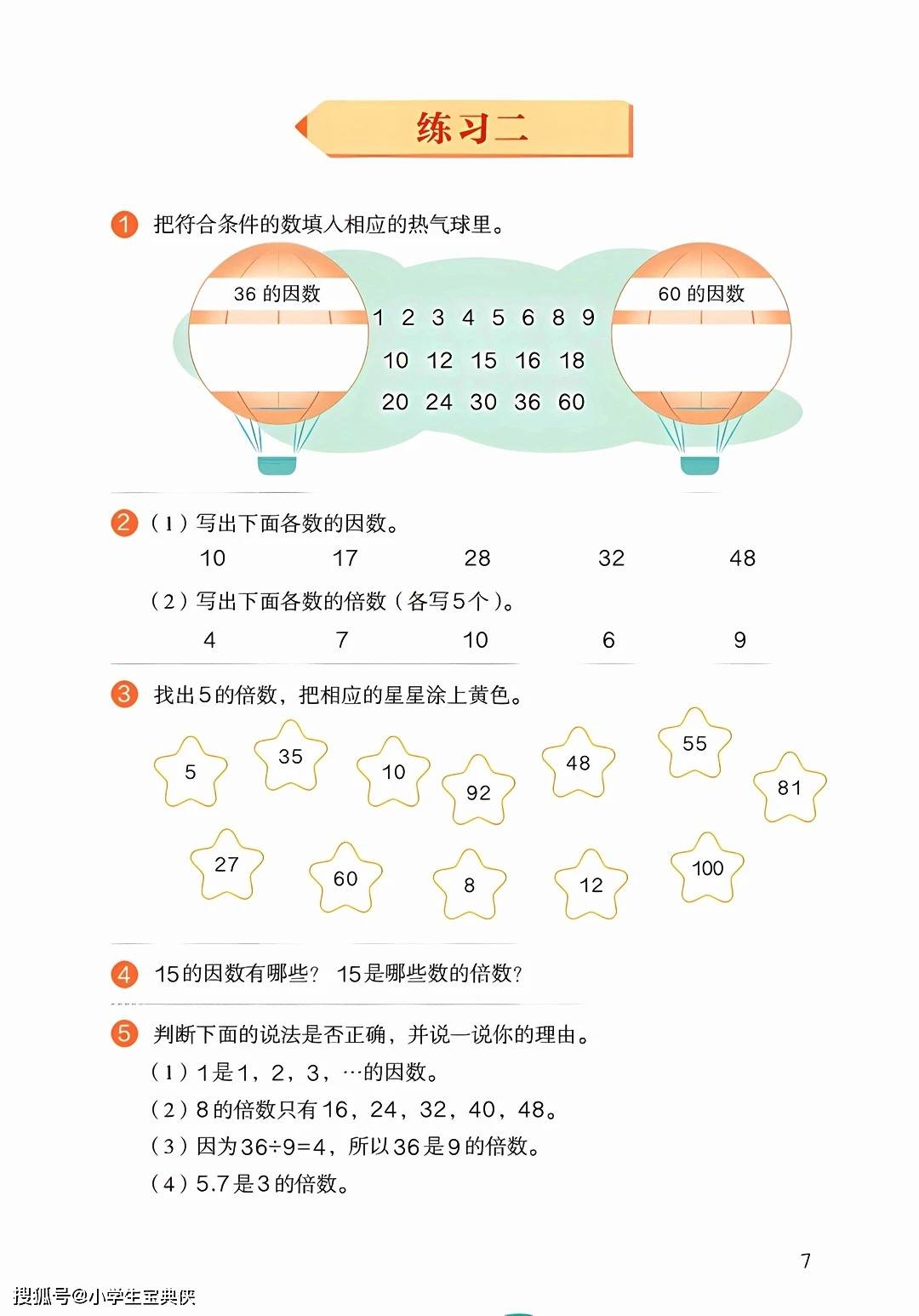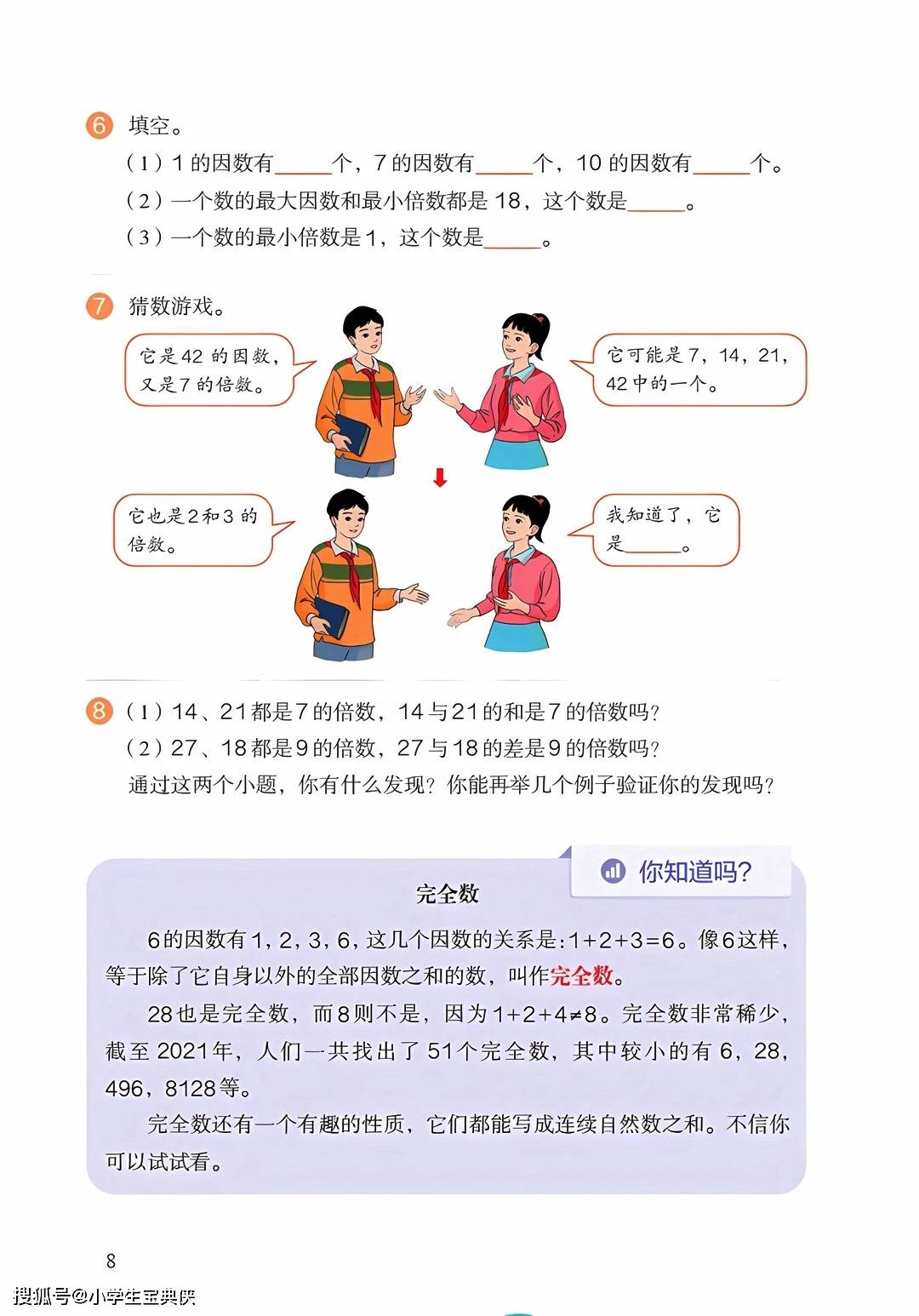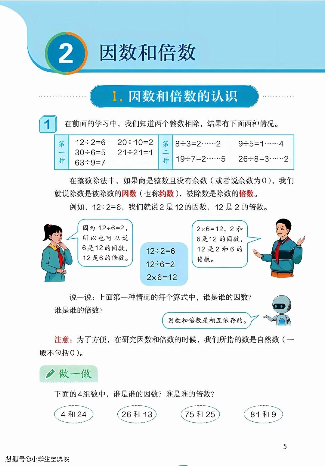 因数和倍数是数与代数领域的重要基础。教材通过整数除法引入因数和倍数的概念,指出在商为整数且没有余数的情况下,除数和商是被除数的因数,被除数是除数和商的倍数。找因数的方法是从 1 开始依次试除,而找倍数则是通过乘法得到。一个数的因数个数有限,倍数个数无限,最小倍数和最大因数都是它本身。