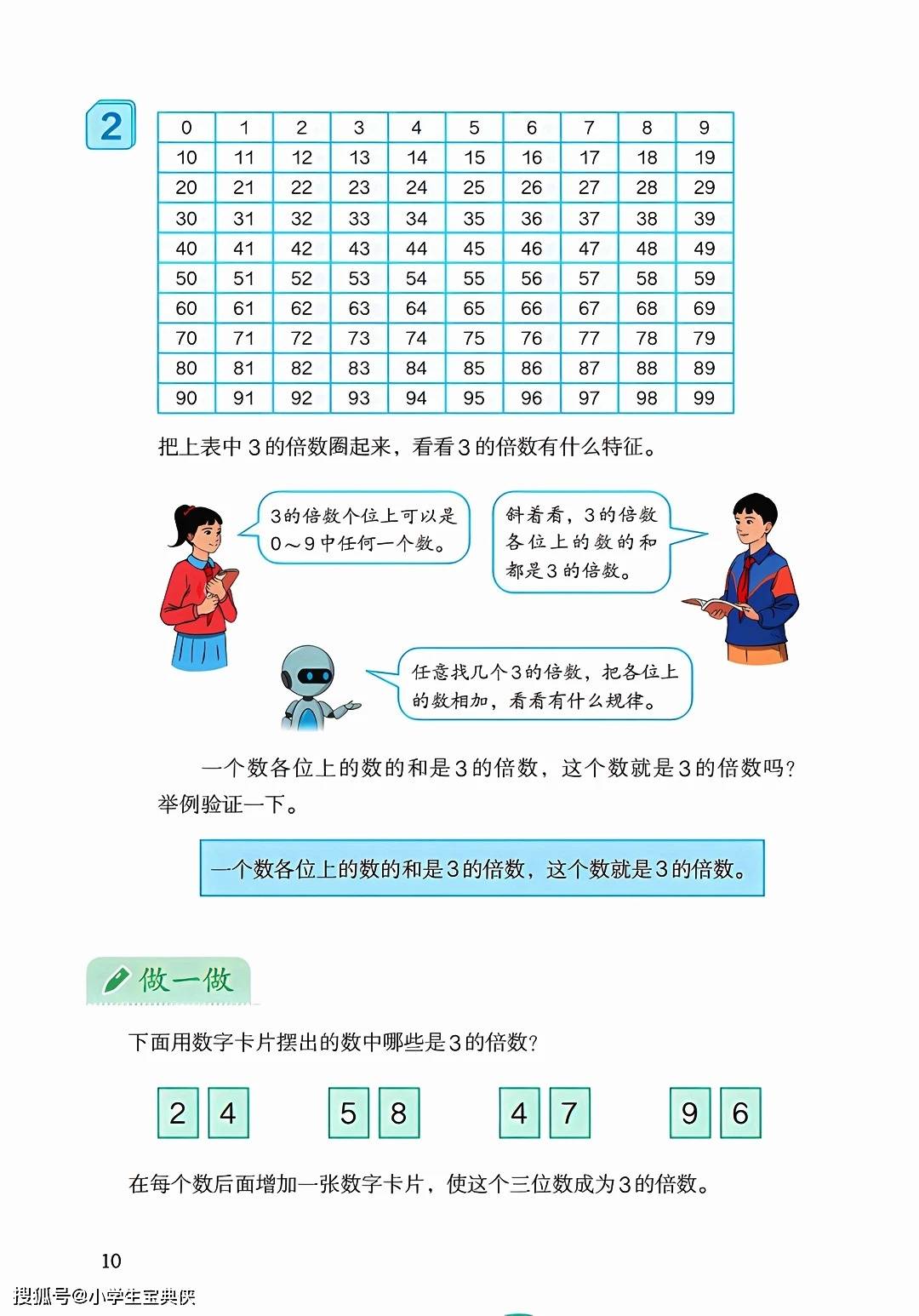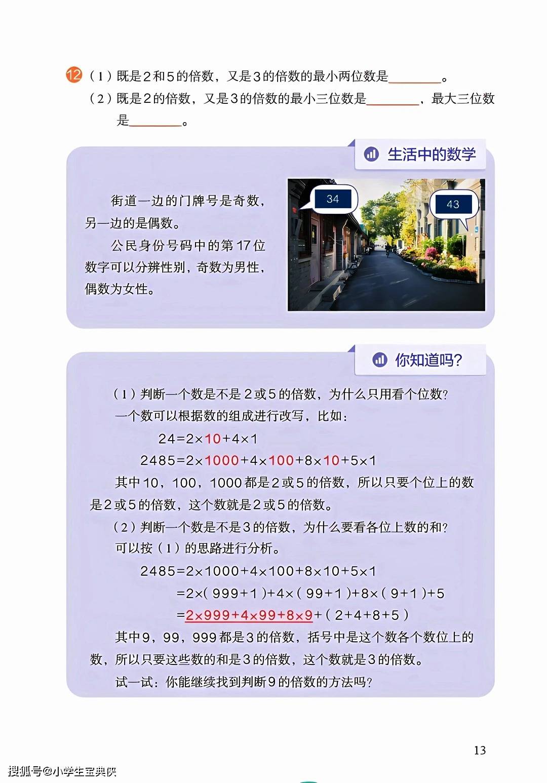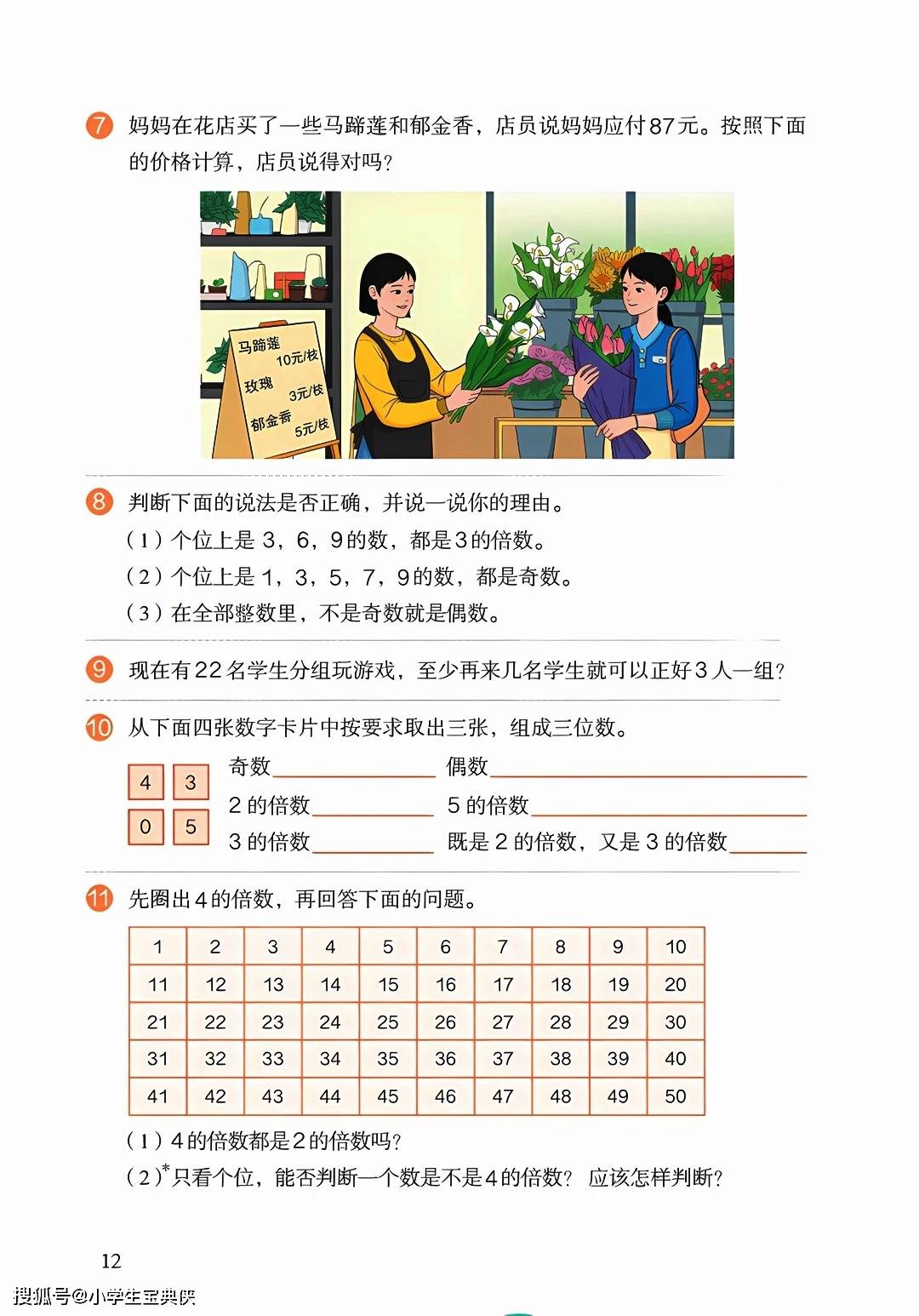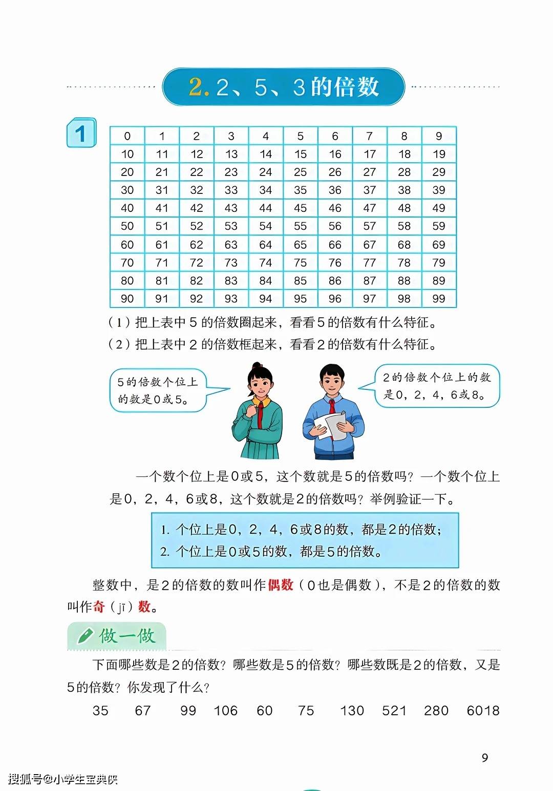 因数和倍数是数与代数领域的重要基础。教材通过整数除法引入因数和倍数的概念,指出在商为整数且没有余数的情况下,除数和商是被除数的因数,被除数是除数和商的倍数。找因数的方法是从 1 开始依次试除,而找倍数则是通过乘法得到。一个数的因数个数有限,倍数个数无限,最小倍数和最大因数都是它本身。