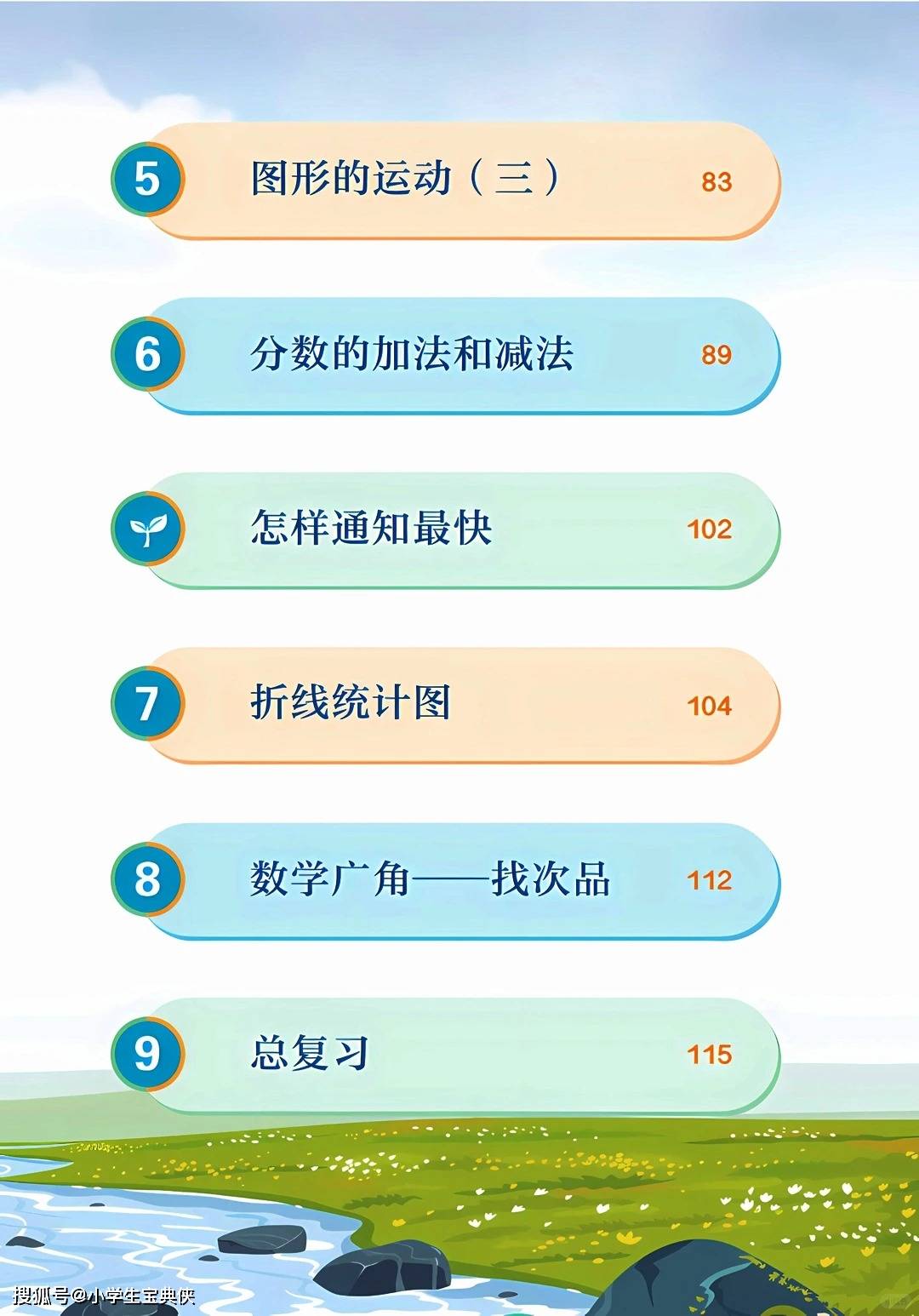 分数的意义和性质是本册教材的另一个重点。教材首先通过单位 “1” 的平均分引入分数的概念,指出分数表示其中的一份或几份。分数单位是表示一份的数。分数与除法存在对应关系,被除数除以除数等于分数形式。分数的基本性质指出,分子和分母同时乘或除以同一个不为 0 的数,分数大小不变。约分和通分都是基于这一性质进行的操作,约分是将分数化为最简形式,通分则是将异分母分数化为同分母分数,以便进行比较和运算。