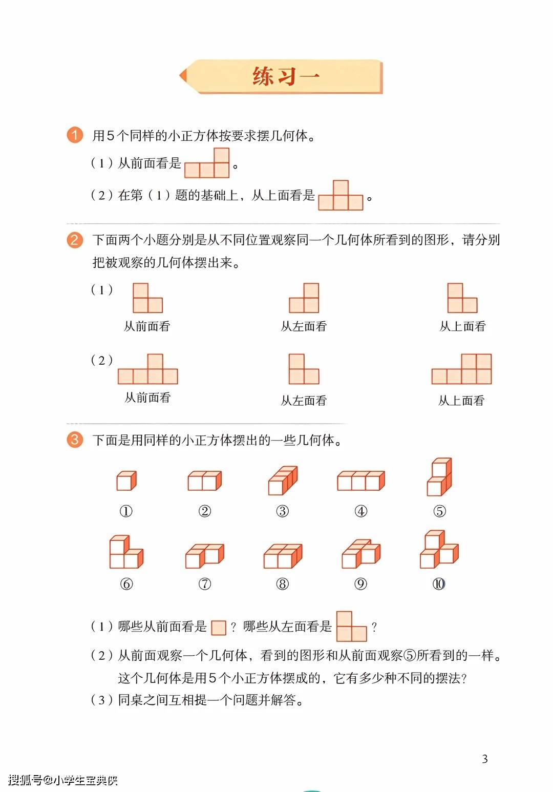 在观察物体(三)部分,学生主要学习根据从不同方向看到的平面图形来还原立体图形。通过从前面、上面、左面三个方向的观察结果,可以推断出小正方体的摆放方式。同一个视图可能对应多种摆法,而三个方向的视图通常能确定唯一的几何体结构。这一部分内容有助于学生建立空间想象能力,理解立体图形与平面图形之间的对应关系。