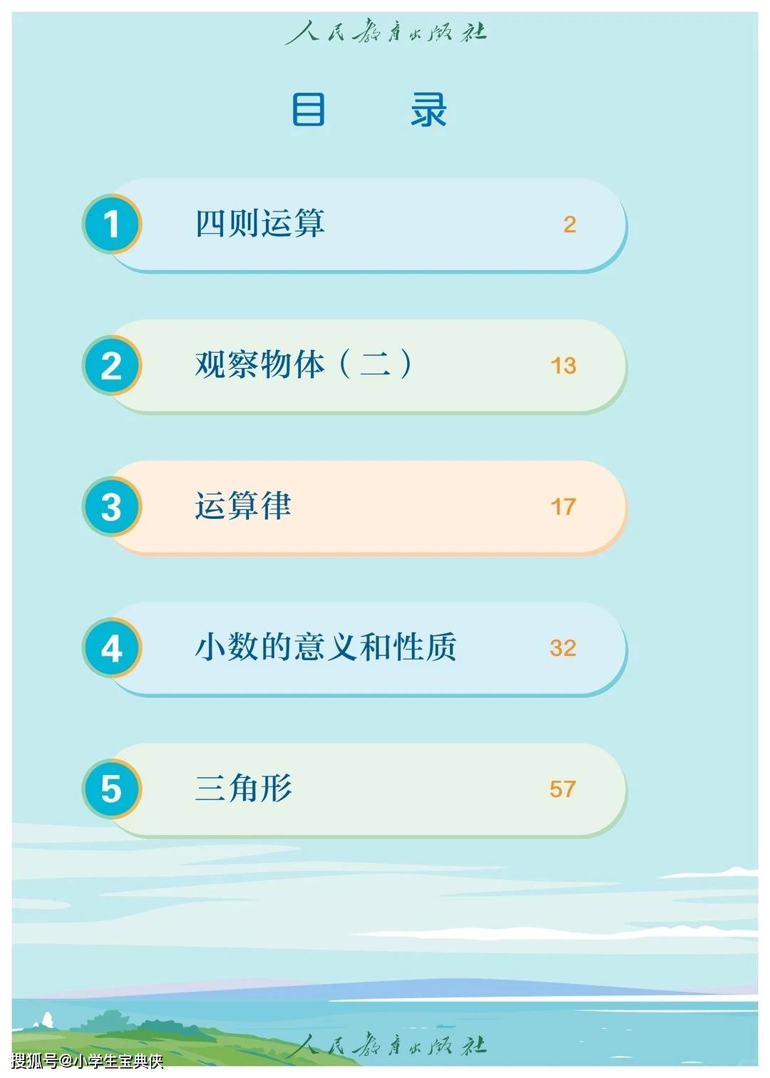 今天为大家分享:人教版四年级下册数学教材包含四则运算、观察物体(二)、运算律、小数的意义和性质、三角形、小数的加法和减法、图形的运动(二)、平均数与条形统计图、数学广角 —— 鸡兔同笼、总复习十个部分。