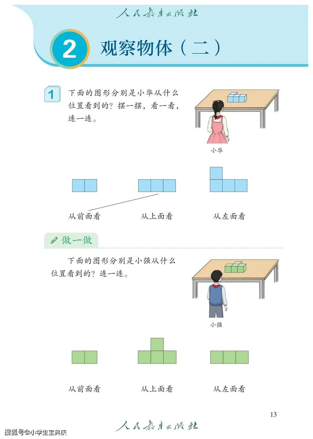 • 知识点:能辨认从不同方向(前面、上面、左面)观察由多个小正方体搭成的立体图形所看到的平面图形。通过观察、想象、操作等活动,理解同一立体图形从不同位置观察,看到的图形可能相同也可能不同;不同立体图形从同一位置观察,看到的图形可能相同。