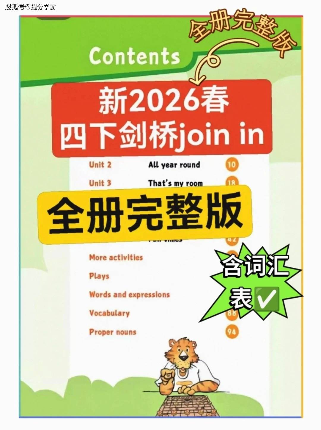 今天为大家分享:新学期伊始,不少家长和孩子发现,手中的《剑桥 Join In 英语》四年级下册教材已经悄然升级为 2026 春新版。翻开这本教材,你会发现它不再是枯燥的单词和语法堆砌,而是一本充满童趣、贴近生活的英语启蒙手册。