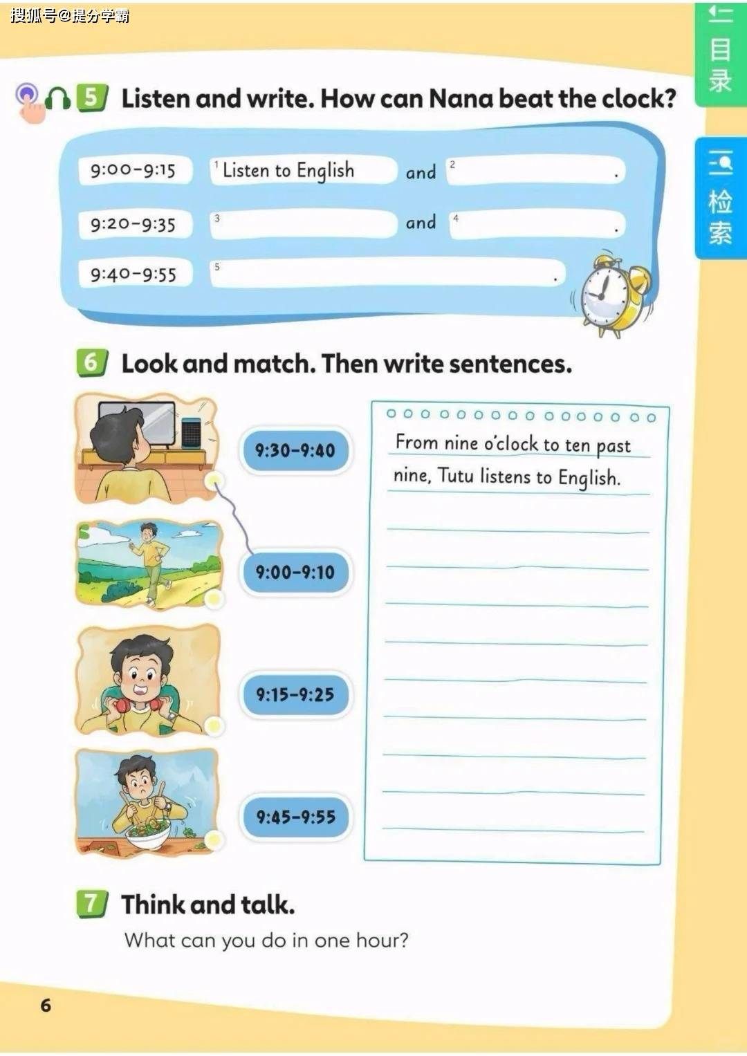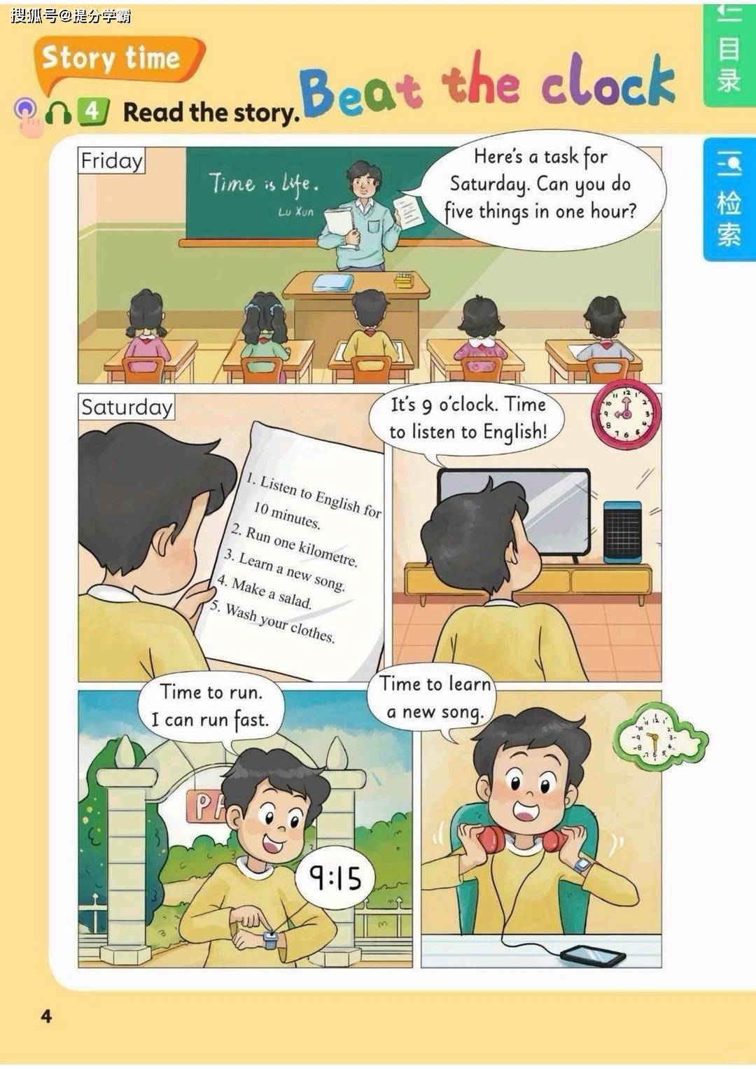 如果说基础知识点是教材的骨架,那么 “Story time” 就是让它活起来的血肉。单元中的 “Beat the clock” 故事,讲述了男孩图图在周六一小时内完成五项任务的有趣经历。从 9 点准时听英语,到 9:15 出门跑步,再到学新歌、做沙拉、洗衣服,每个时间节点都对应具体的生活场景。这种 “时间 + 事件” 的叙事方式,不仅让孩子在阅读中巩固了时间表达,更潜移默化地学会了规划时间,实现了语言学习与生活能力的双重提升。