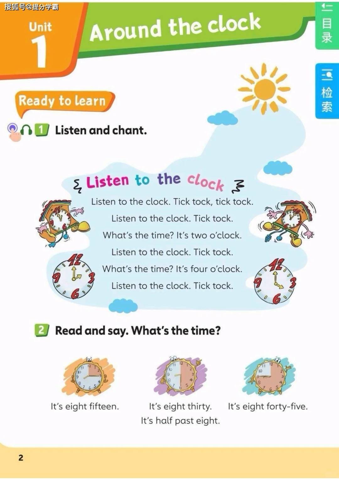 新版教材的开篇单元 “Around the clock” 就用一首朗朗上口的《Listen to the clock》歌谣,把时间表达变成了游戏。“Tick tock, tick tock. What's the time? It's two o'clock.” 简单的歌词搭配生动的时钟插图,让孩子在吟唱中自然学会整点表达。随后的 “Read and say” 环节,通过三个色彩各异的时钟,直观展示了 “fifteen”“thirty”“forty-five” 等时间词汇,还巧妙引入了 “half past eight” 这样的英式表达,为孩子打下扎实的基础。