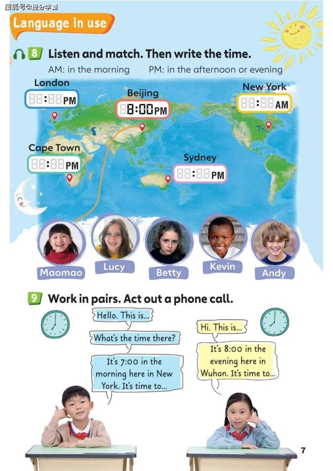 教材的用心还体现在细节设计上。比如 “Look at the clocks” 练习中,摆满各式钟表的老钟表匠铺插图充满复古趣味,孩子需要根据钟表指针写出对应时间,在观察力和语言能力之间搭建桥梁;“Listen and write” 环节则通过娜娜的时间规划表,训练孩子的听力抓取和信息整理能力;而 “Language in use” 板块引入的世界时区地图,更是把时间表达从个人生活拓展到全球视野,让孩子明白 “北京时间晚上 8 点” 对应 “纽约时间早上 7 点”,在语言学习中埋下世界观的种子。