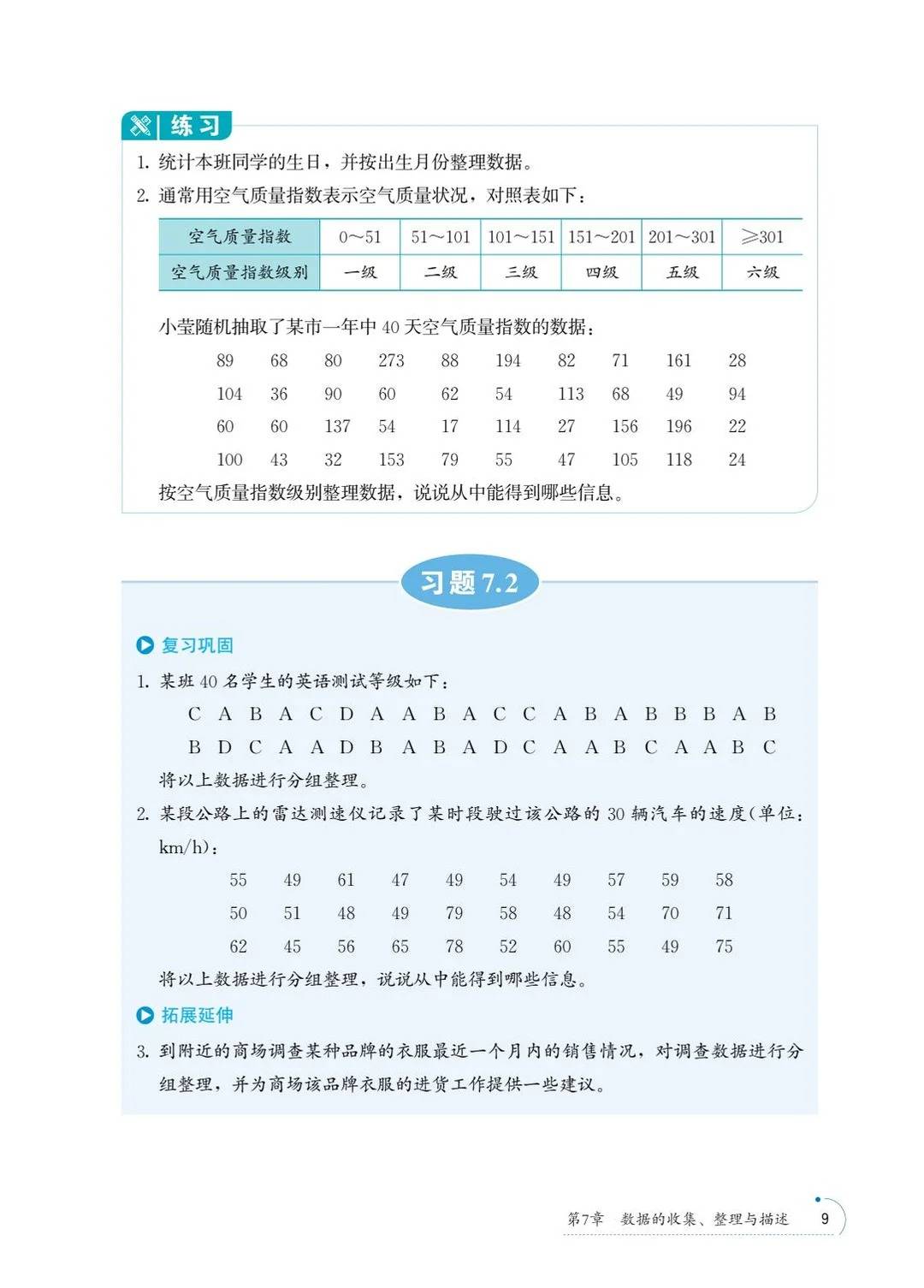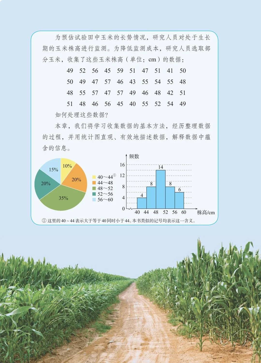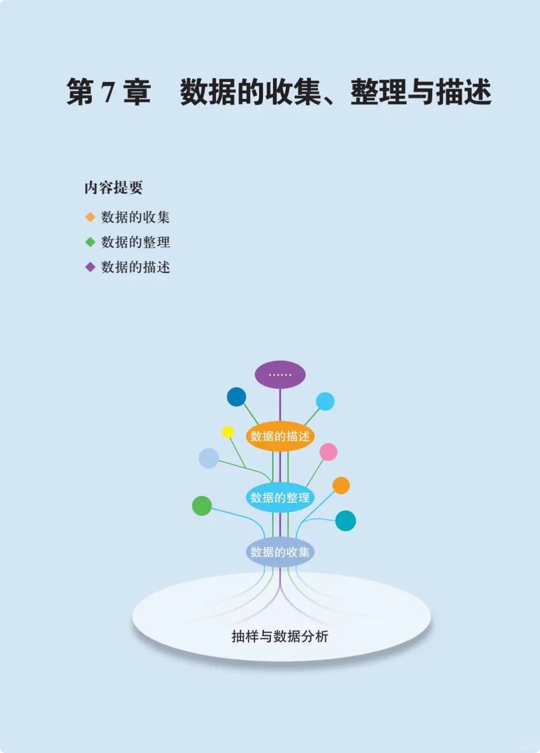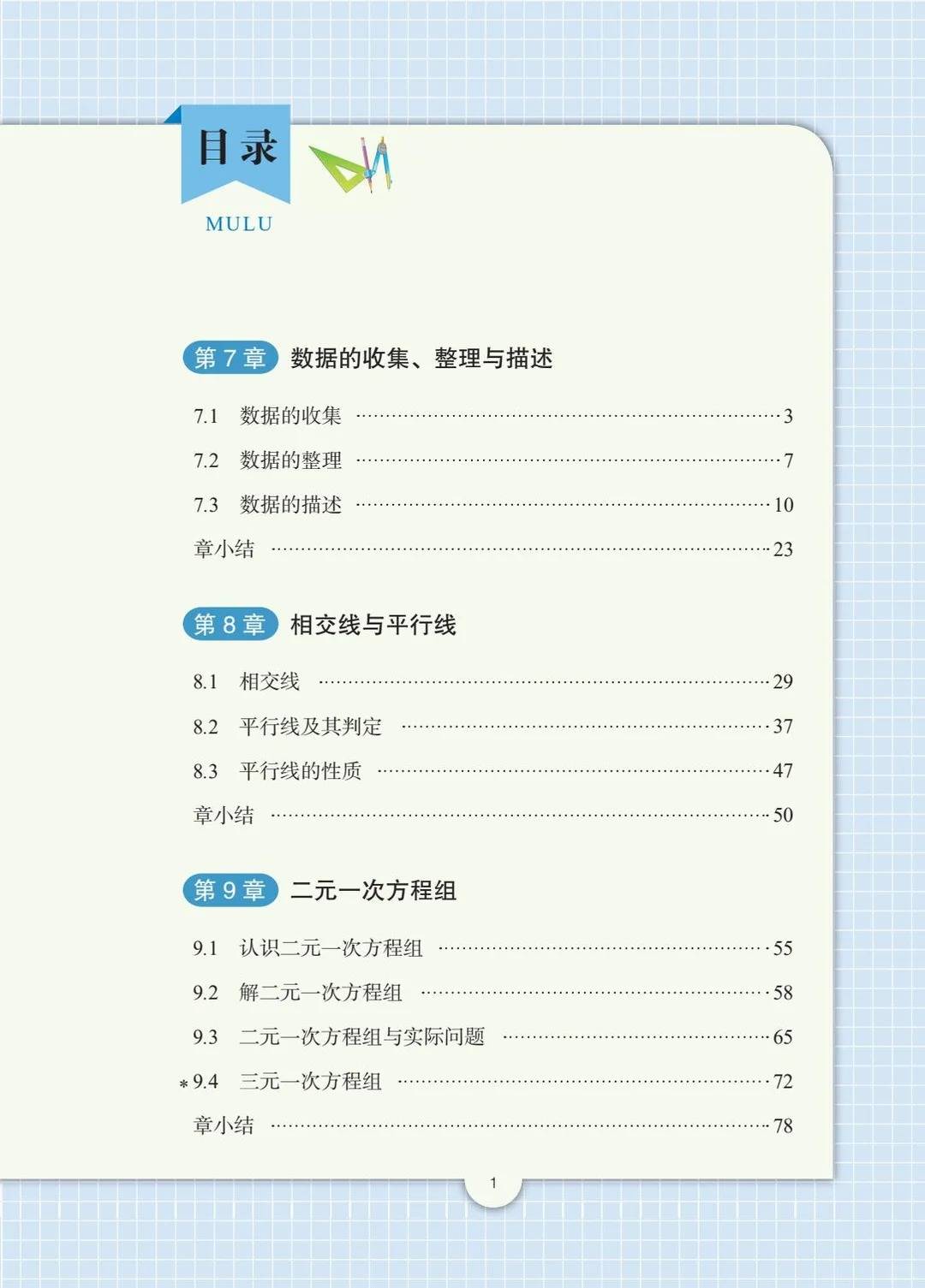开篇第 7 章 “数据的收集、整理与描述” 系统讲解统计的基础流程,首先区分普查与抽样调查的适用场景,以第七次全国人口普查为例说明普查的全面性,又通过电子产品防水测试等案例,介绍抽样调查的必要性与简单随机抽样的原则。接着,教材引导学生经历数据整理的完整过程,如对玉米株高数据进行分组、统计频数;最后学习用扇形图、直方图等图表描述数据,直观呈现信息。后续第 8 章 “相交线与平行线” 聚焦几何入门,讲解对顶角、邻补角的性质,平行线的判定与性质,为后续三角形、四边形的学习奠定逻辑基础;第 9 章 “二元一次方程组” 则从实际问题出发,引入方程组的概念与解法,培养学生用代数工具解决实际问题的能力。