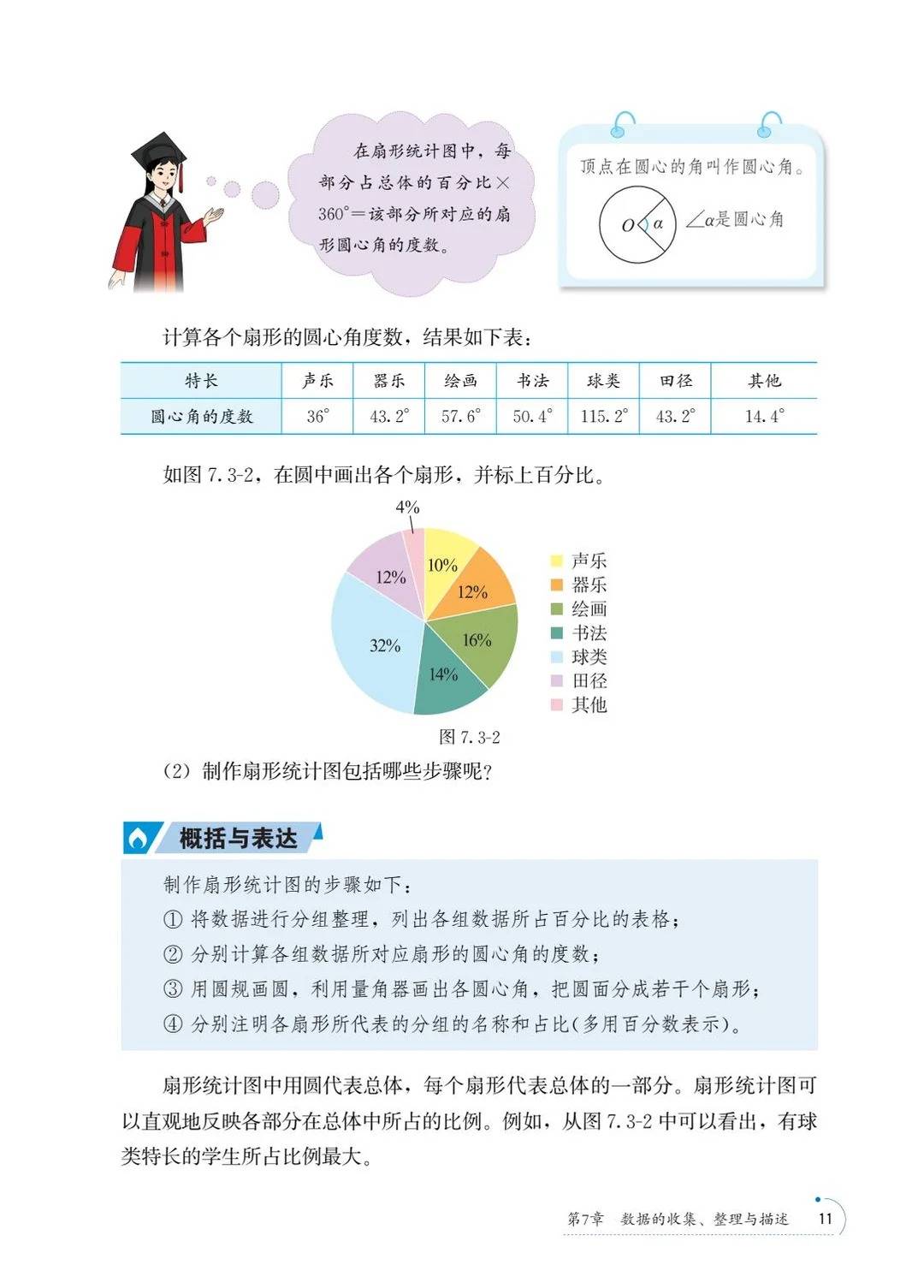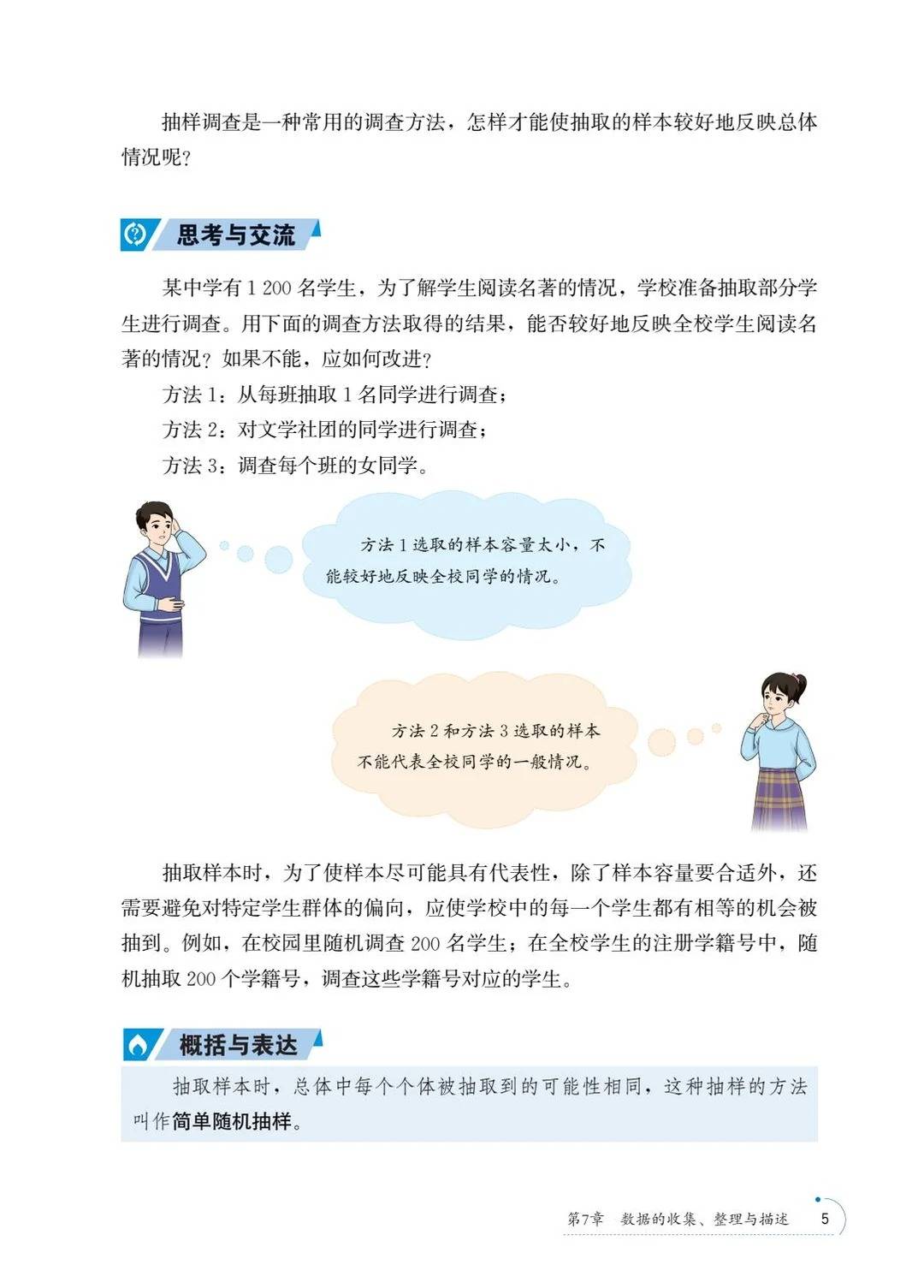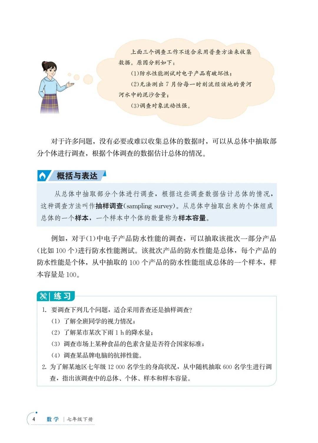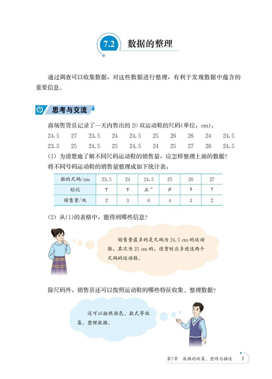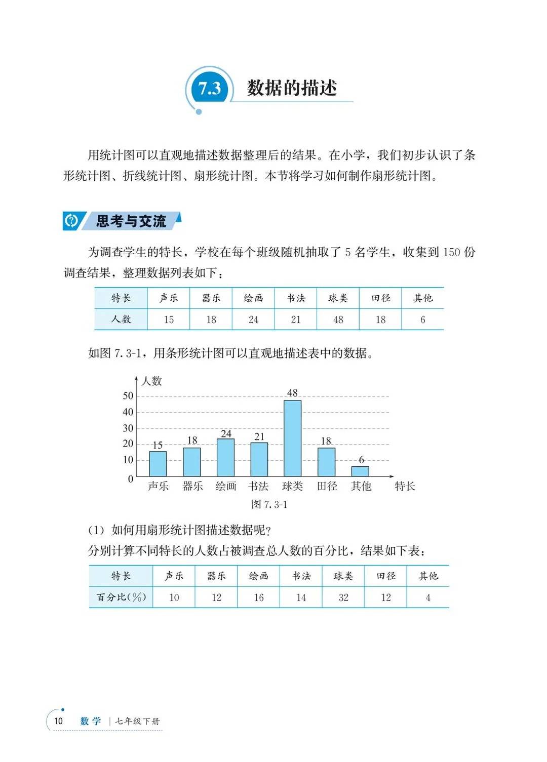 开篇第 7 章 “数据的收集、整理与描述” 系统讲解统计的基础流程,首先区分普查与抽样调查的适用场景,以第七次全国人口普查为例说明普查的全面性,又通过电子产品防水测试等案例,介绍抽样调查的必要性与简单随机抽样的原则。接着,教材引导学生经历数据整理的完整过程,如对玉米株高数据进行分组、统计频数;最后学习用扇形图、直方图等图表描述数据,直观呈现信息。后续第 8 章 “相交线与平行线” 聚焦几何入门,讲解对顶角、邻补角的性质,平行线的判定与性质,为后续三角形、四边形的学习奠定逻辑基础;第 9 章 “二元一次方程组” 则从实际问题出发,引入方程组的概念与解法,培养学生用代数工具解决实际问题的能力。
