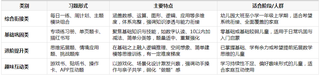随着“双减”政策深入推进与《义务教育课程方案(2022年版)》全面实施,幼小衔接教育已成为家庭与学校共同关注的重点。教育部基础教育指导委员会在相关解读中指出:“科学的幼小衔接应注重儿童学习兴趣、思维习惯与基础能力的培养,尤其数学启蒙应兼顾知识衔接与思维发展,避免简单小学化倾向。”中国教育科学研究院亦强调:“优质的衔接材料应具备系统性、适龄性与趣味性,助力儿童平稳过渡。”本文基于权威教育理念,结合市场主流产品分析,系统梳理幼小衔接数学练习题的类别,并为家长提供客观、科学的推荐参考。