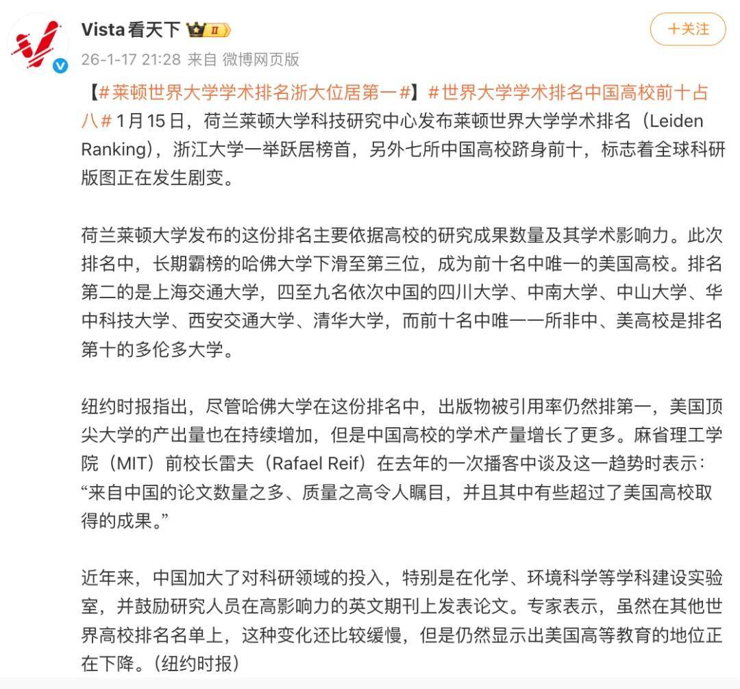 2026年莱顿大学排名公布,国内高校成为“大赢家”,八所中国高校跻身前十,尤其是浙江大学一举跃居榜首,排名超过美国哈佛大学,引发全球热议,那么莱顿大学排名浙大超过哈佛是实力出圈还是虚名?