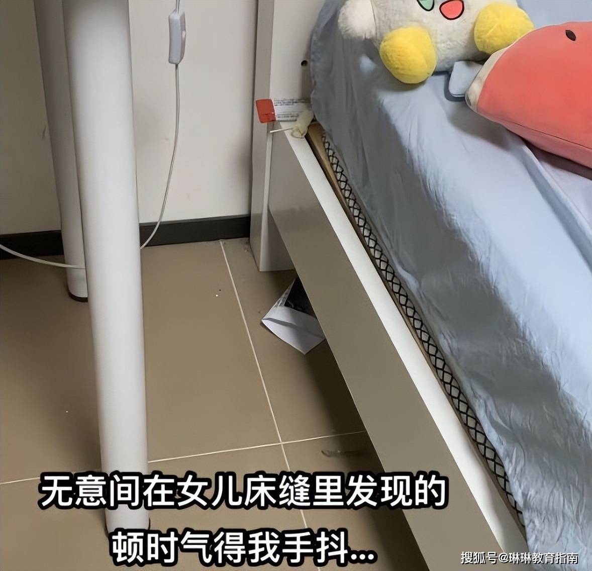 打开卧室门,家长一眼就被床垫缝隙里的一个物品吸引住了目光,那是一个浅黄色的橡胶制品,旁边还有一根用过的棉签,床底下还有一张被遗忘的A4纸,冲动下,她怀疑女儿早恋了。