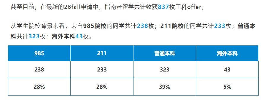 截至目前,在最新的26fall申请中,指南者留学共计收获837枚工科offer;