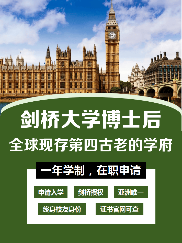 英国剑桥大学博士后项目是面向亚洲地区以及中国高级管理者、国内高校教师以及科研人员等参加的高端研究型教育项目.该项目专门针对系统接受过博士或博士相当教育水平人士而开办的.项目以个人课题研究与教授指导相结合,注重研究与实践的结合,学员通过参加博士后所取得的研究经验和成就,从而极大地提升个人综合能力和学术视野.