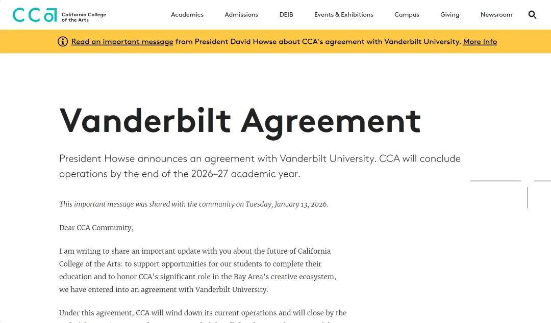 今天,我们怀着对历史最深切的敬意与对未来最坚定的期望,向我们的社区宣布一项关于学院未来的重大决定:加州艺术学院已与享誉全球的范德堡大学达成一项开创性协议。这并非一个轻易的决定,而是一份经过深思熟虑、旨在守护CCA百年精神火种,并为其在更广阔平台上绽放光芒的郑重承诺。