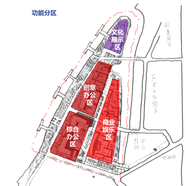 功能滞后:原有工业码头功能衰退,与周边创新园区、历史街区及行政办公功能不匹配。