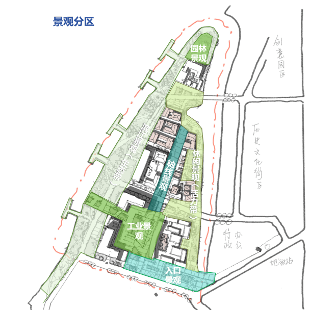 保留建筑与历史文脉需形成中心节点:围合布局可以三处保留建筑为锚点,围绕其组织绿化或广场,强化空间序列与场所记忆,形成场地特色。
