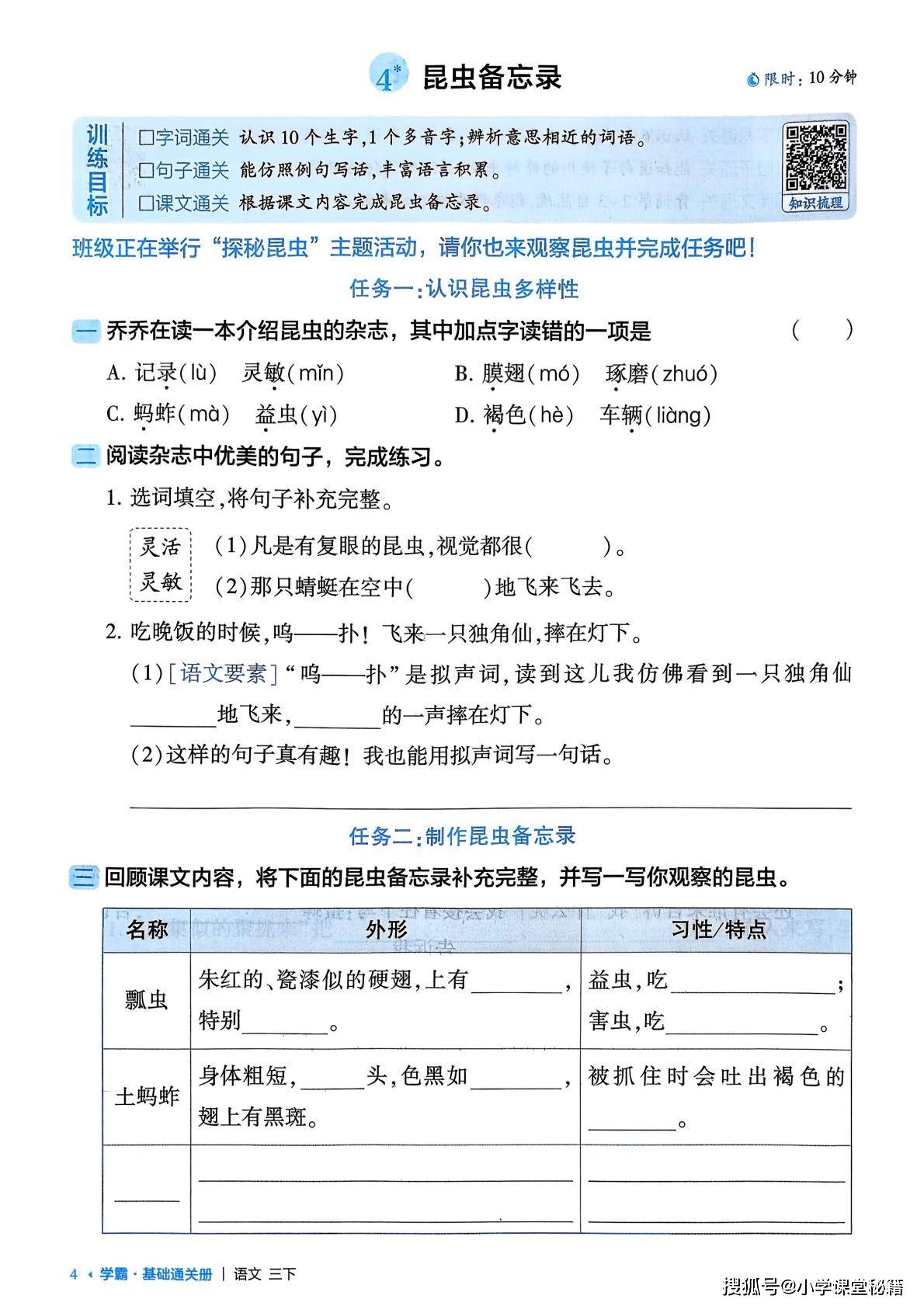 从学习帮助来看,这份通关册能让孩子在同步学习中精准突破薄弱点。字词通关板块聚焦易错音、多音字和形近字,有效减少基础题失分;句子通关通过仿写、品析提升语言运用能力;课文通关则以填空、梳理内容等方式,强化对课文的理解与记忆。每课 10 分钟的限时设计,避免了练习疲劳,让孩子能高效完成每日巩固。此外,配套的二维码知识梳理和参考答案,也方便家长和孩子及时核对、查漏补缺,形成 “学习 — 练习 — 巩固” 的完整闭环。