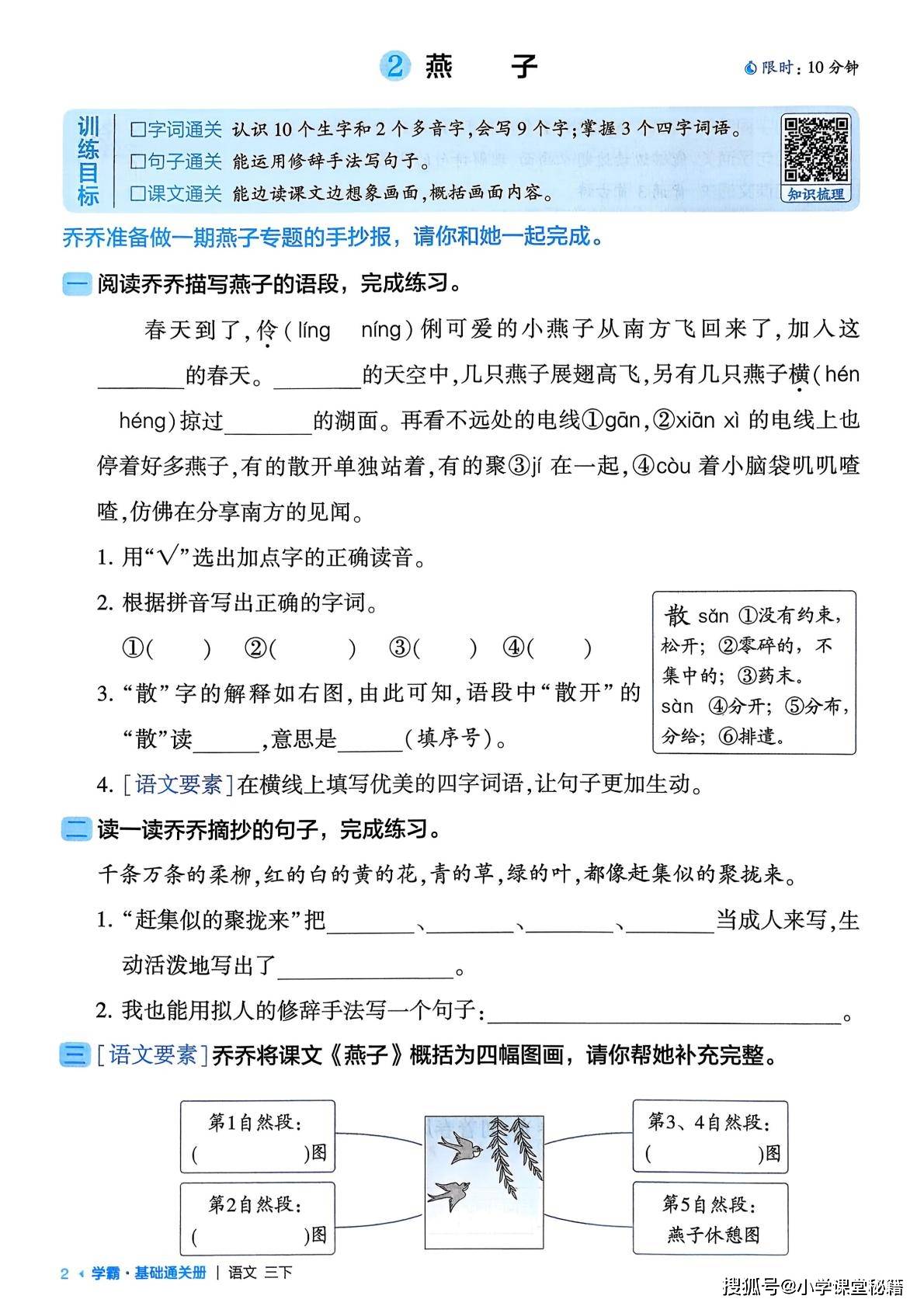 今天为大家分享:这本三年级下册语文基础通关册,以教材单元为脉络,将每课知识点拆解为可落地的练习模块,是同步巩固课堂所学的实用工具。它覆盖全册八个单元的所有课文,从《古诗三首》《燕子》等开篇篇目,到《慢性子裁缝和急性子顾客》《漏》等趣味课文,每课都设计了 “字词通关 — 句子通关 — 课文通关” 的分层练习,精准对应三年级语文的学习目标。