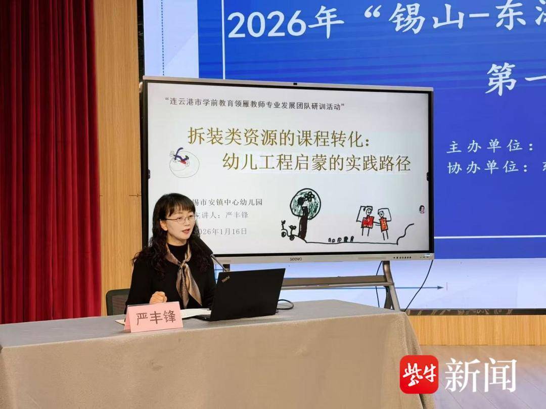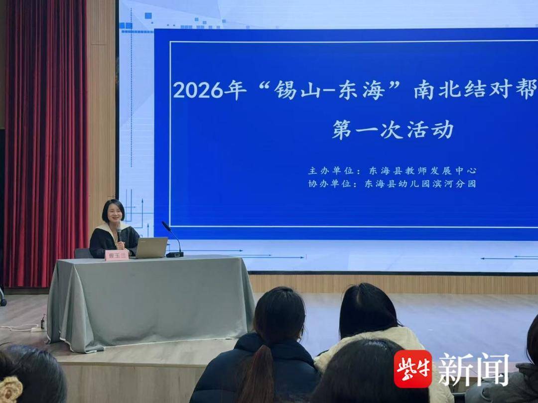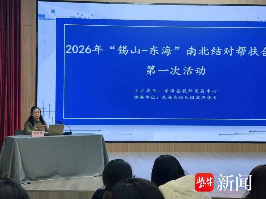 为深入贯彻江苏省南北结对帮扶合作战略,深化连云港、无锡两地学前教育协同发展,提升东海县学前教育教师课程资源开发利用能力,2026年1月16日,2026年“锡山-东海”南北教育结对合作第一次活动在东海县幼儿园滨河分园成功举办。