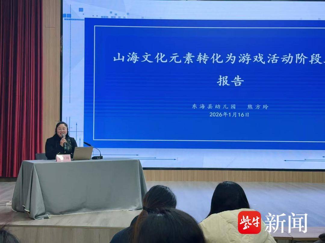 当日下午,东海县幼儿园熊方玲以《山海文化元素转化为游戏活动阶段工作报告》为题,汇报了本土文化资源课程化的阶段性成果;无锡市梅村街道中心幼儿园曹玉兰园长围绕《互动育人模式引领下地域文化伴学活动的开发与实施》展开深度分享,为两地教师提供了优质课程资源开发的实践范例;东海县幼儿园王子胤老师主持分组研讨,参与教师围绕活动主题,结合教学实际交流心得、碰撞思路,形成了多项富有建设性的教学共识。活动最后,市教育局基教处吉海霞处长做总结,吉处长强调,各园要以“山海·游戏·共建”项目为抓手,以系统思维深化幼儿园课程资源的挖掘与利用,让幼儿在山海文化活态传承的课程实践获得最大限度的学习与发展。