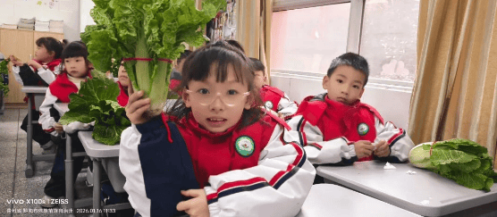 这些蔬菜是孩子们一学期以来浇水、施肥、亲手照料的成果。当邹老师将蔬菜递到每个孩子手中时,孩子们捧着的仿佛不只是青菜,更是自己用汗水换来的“成长勋章”,一张张小脸上写满了自豪。