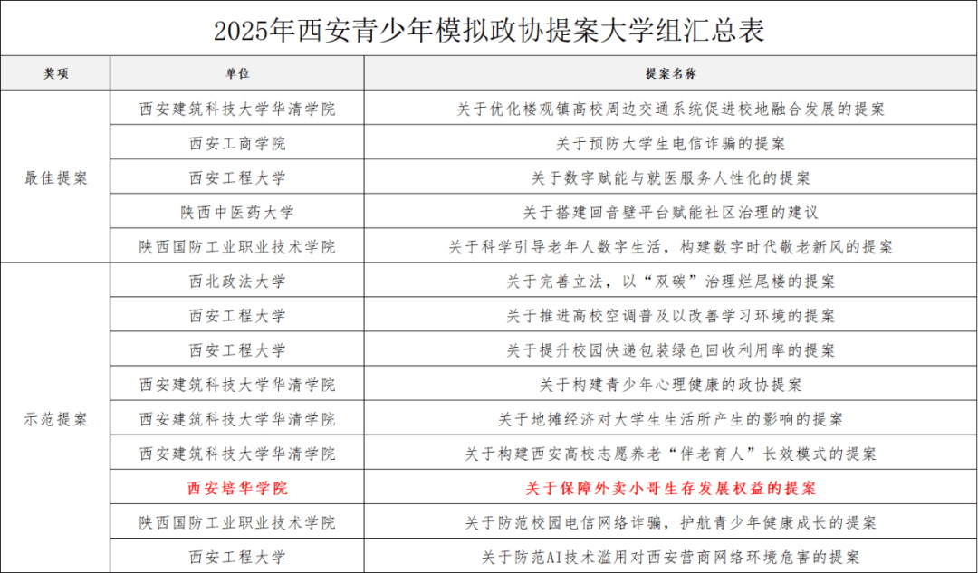 近日,由市政协办公厅、团市委、市教育局、市青联、市学联等多部门联合主办的西安市“青少年模拟政协提案征集”活动结果揭晓。在校党委副书记、副校长姚文静教授与马克思主义学院青年教师王朋的共同指导下,学生作品《关于保障外卖骑手生存发展权益的提案》凭借扎实的调研与切实可行的建议,在众多提案中脱颖而出,荣获“示范提案”。该提案聚焦新就业形态劳动者的权益保障问题,体现了当代大学生关注社会现实、勇担时代使命的深刻洞见与人文关怀。