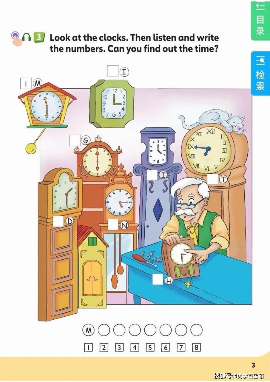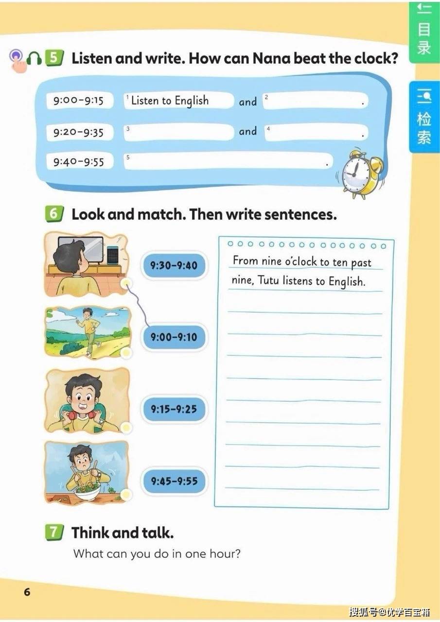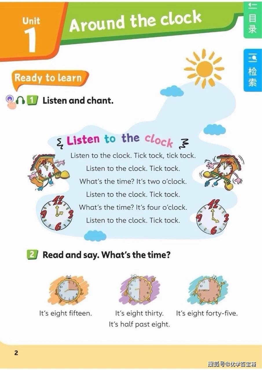开篇单元 “Around the clock” 以时间为核心主题,通过《Listen to the clock》歌谣引入整点表达,如 “What's the time? It's two o'clock.”,再拓展到 “eight fifteen”“half past eight” 等非整点时间的表达。学生将在 “Look at the clocks”“Listen and write” 等活动中,结合复古时钟图片与时间规划表,练习识别时间并描述日常活动,如 “From nine o'clock to ten past nine, Tutu listens to English.”。单元还融入世界时区对比,通过模拟电话对话让学生了解不同城市的时间差异,如 “New York 早上 7 点” 与 “Wuhan 晚上 8 点”,并引导学生规划周末时间,培养时间管理意识。