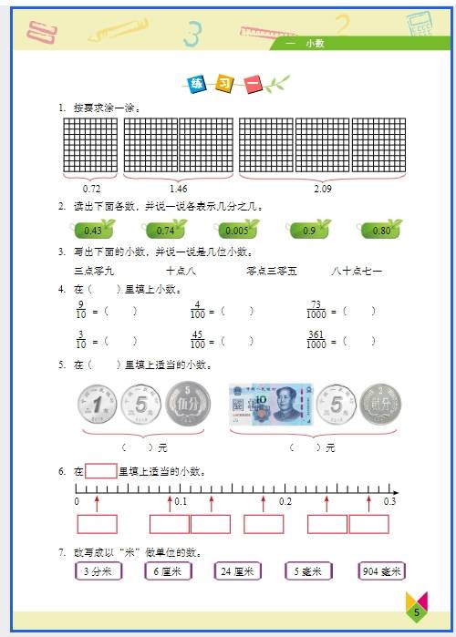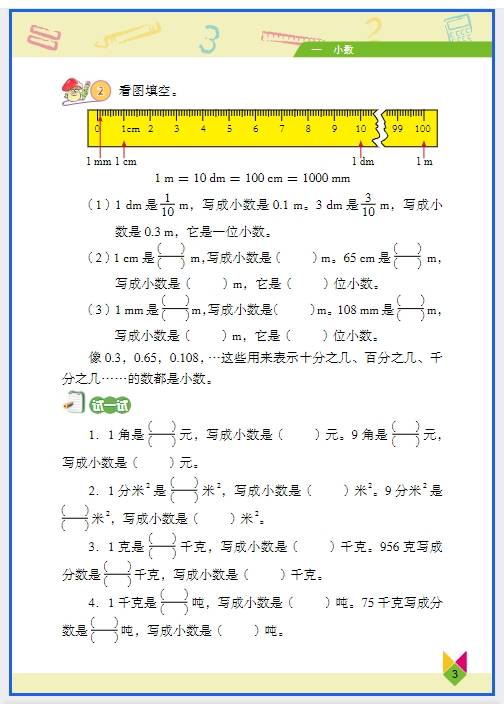 • 单位换算:小单位化大单位 ÷ 进率,大单位化小单位 × 进率(重点记进率:1 米 = 100 厘米,1 千克 = 1000 克,1 元 = 10 角 = 100 分)。
