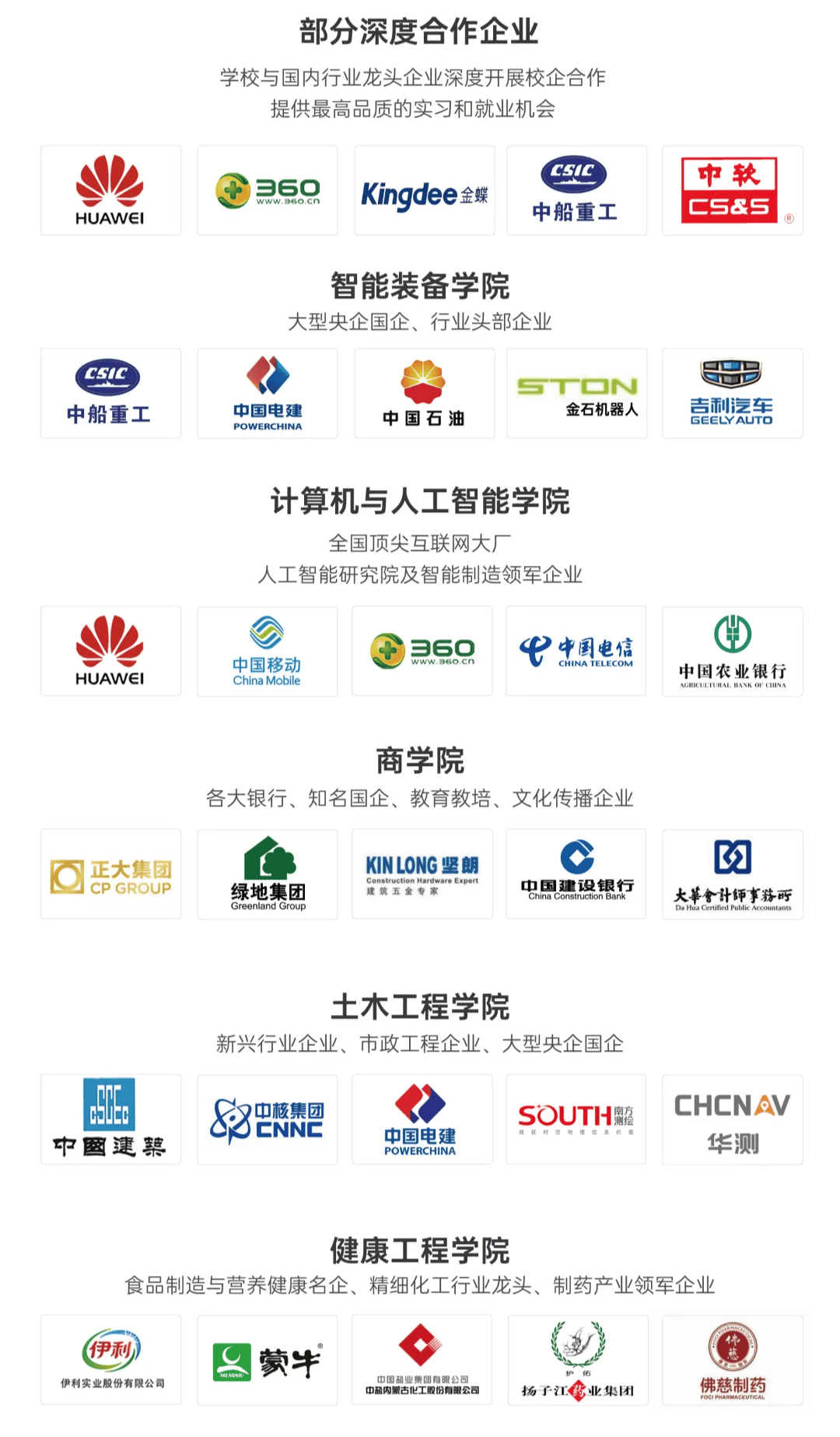 A: 学校拥有强大的“名企朋友圈”。通过与华为、吉利、中船等行业龙头共建11个现代产业学院和“英才班”,学校将企业培训前置到大学课堂。数据显示,46.3% 的毕业生成功入职中石油、国家电网等央企国企,31.5% 入职世界500强企业,真正实现了“入学即入行,毕业即高薪” 。