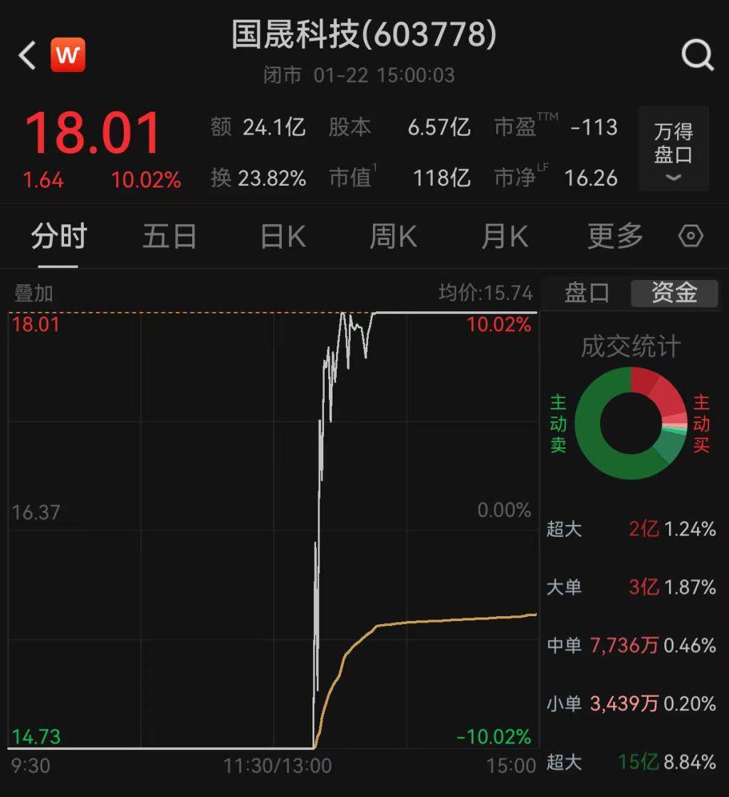 1月22日,国晟科技(603778.SH)开盘一字跌停,午后直线拉升上演“地天板”,短短13分钟左右股价反转,直冲18.01元。截至收盘,该股封板涨停,成交超24亿元。1月15日至1月21日连续5个交易日,国晟科技均跌停。