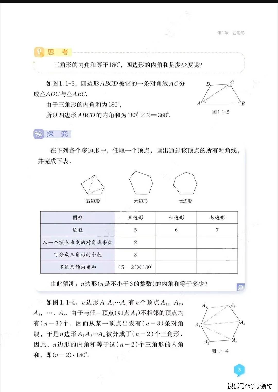 这套教材最鲜明的特点是 “几何与代数的深度融合”。开篇的《四边形》单元,从多边形内角和入手,逐步深入平行四边形、矩形、菱形、正方形的性质与判定,通过 “观察 — 思考 — 探究” 的层层递进,让学生理解特殊四边形之间的演变关系。比如从平行四边形到矩形的推导,教材用 “对角线相等的平行四边形是矩形” 这一判定定理,把图形性质和逻辑推理结合起来,培养学生的几何论证能力。
