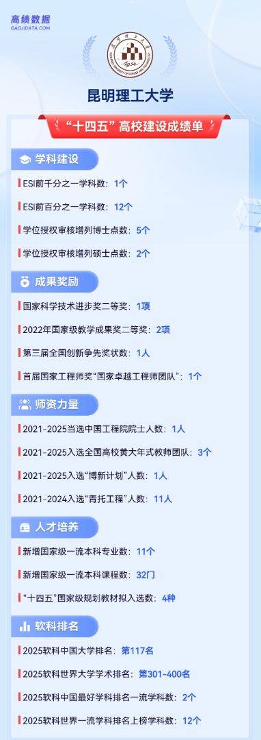 冶金工程、矿业工程学科在2025软科世界一流学科排名跻身全球50强(冶金工程40,矿业工程15);工程学入围ESI全球前1‰,成为省内高校唯一,前1%学科由4个增至12个。昆明理工大学“十四五”期间入选3个全国高校黄大年式教师团队,四批共入选4个,数量并列全国第二位。获评云南唯一的“国家卓越工程师团队”,也是非“双一流”高校中唯一的“国家卓越工程师团队”。昆明理工大学脚踏实地,扎根西南,奋力书写高质量发展的新篇章。
