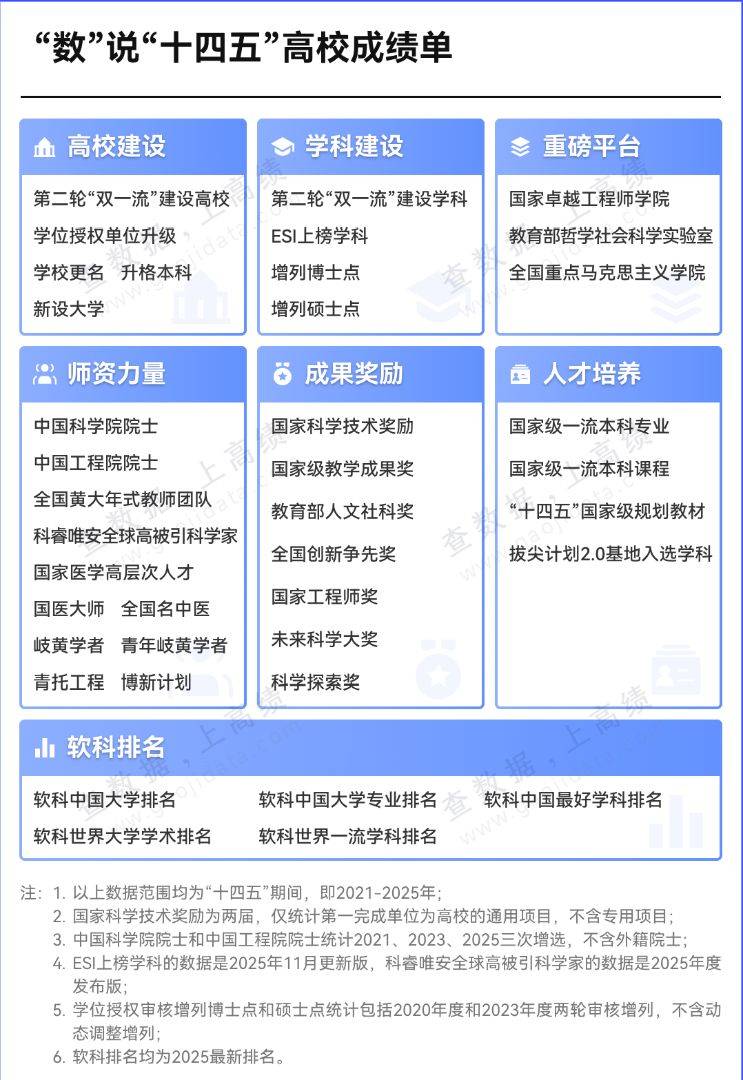 五年来,我国高等教育飞速发展,建设教育强国进展成效显著。近30所本科学院实现更名,圆“大学”梦;70余所高校奋斗数十载,申博成功;33所高校学科水平惊艳全球,跻身ESI前万分之一学科;近100所高校科研成果喜人,荣获国家科学技术奖励;90多所高校卓有建树,迎来新晋两院院士……“十四五”期间,我国高校高质量发展,实现无数重大突破。 “十四五”正好是第二轮“双一流”的建设周期。“十四五”的建设成绩,对第三轮“双一流”遴选至关重要。高绩(ID: gaojidata)推出高校专属“十四五”成绩单,用数据展示高校五年发展成就!