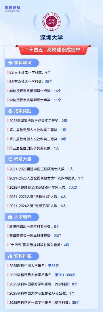 20个学科进入ESI全球排名前1%,其中4个学科进入全球排名前1‰;荣获国家级教学成果奖二等奖2项,教育部人文社科奖二等奖1项、三等奖8项,毛军发院士获全国创新争先奖状;李清泉教授成为深大首位本校产生院士,滨海城市韧性基础设施教师团队入选全国高校黄大年式教师团队,科睿唯安全球高被引科学家达到7人次;2025软科中国大学排名全国第68名,2025软科世界大学学术排名第201-300名,位于非“双一流”高校前列。深圳大学用亮眼的成绩单,走出了高质量发展的足迹。