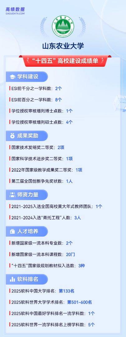 五年来,山农以第一完成单位荣获3项国家科学技术奖,获奖数量并列全省第一。丰硕的科研成果,为一流学科建设提供了有力支撑。山农的学科建设水平持续上升,拥有8个ESI前百分之一学科,其中2个学科跻身全球前千分之一。在2025软科中国大学排名中,山东农业大学位列全国第133名,创5年历史新高。