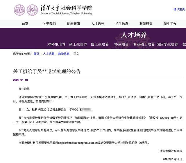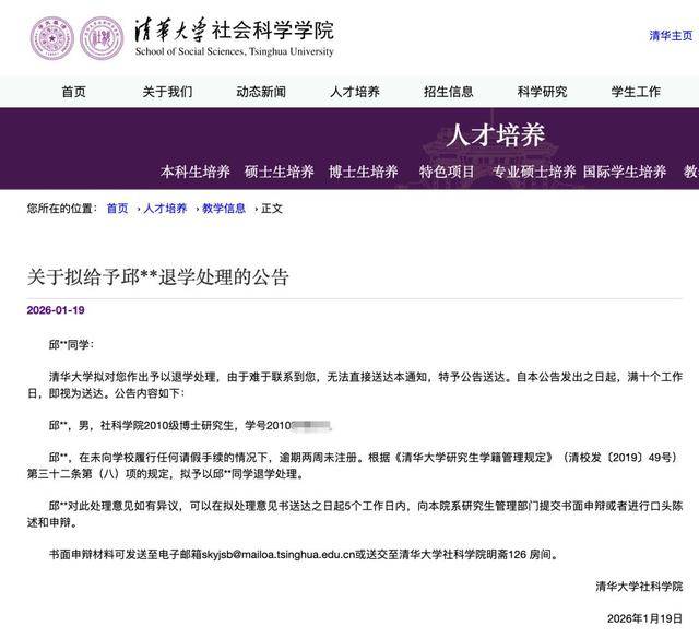 近日,清华大学官网发布通告,对两名博士研究生作出予以退学处理。根据校方通告,邱同学为2010级博士生,吴同学为2013级博士生,两人均因“逾期两周未注册”且未履行请假手续,被依据学籍管理规定拟予退学。