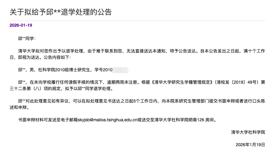 1月19日,清华大学官网发布了两条通报。一名吴姓社科学院2013级博士研究生和一名邱姓社科学院2010级博士研究生,在未向学校履行任何请假手续的情况下,逾期两周未注册。根据《清华大学研究生学籍管理规定》第三十二条第(八)项的规定,拟予以退学处理。