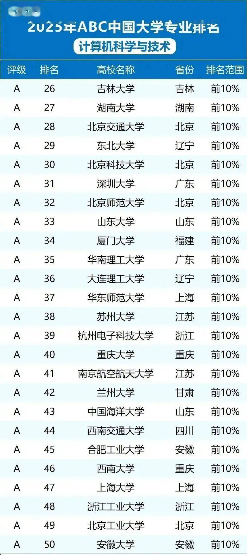 本文将重点展示“计算机科学与技术”专业全国前50高校的排名情况。