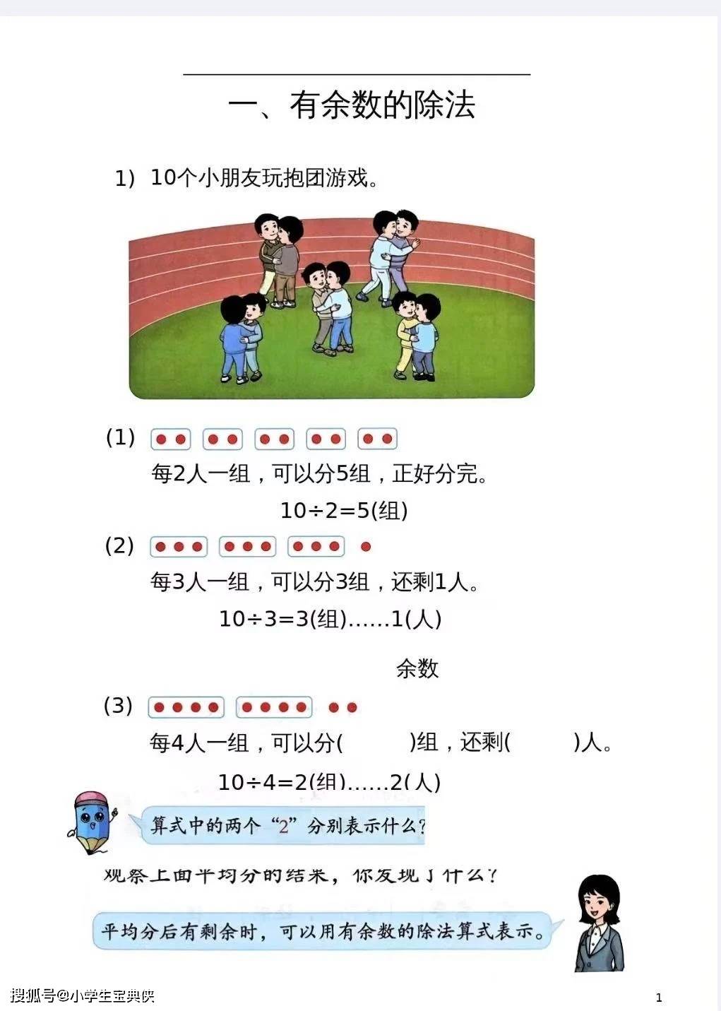 第一个单元就是 “有余数的除法”,这是二年级孩子第一次接触带余数的除法,也是衔接后续数学知识的关键。课本用 10 个小朋友玩抱团游戏的生活化场景引入概念,让孩子在分组过程中自然理解 “平均分后有剩余” 的含义。从每 2 人一组正好分完,到每 3 人一组剩下 1 人,再到每 4 人一组剩下 2 人,一步步引导孩子建立余数的概念,这种螺旋式上升的设计非常符合低年级学生的认知规律。