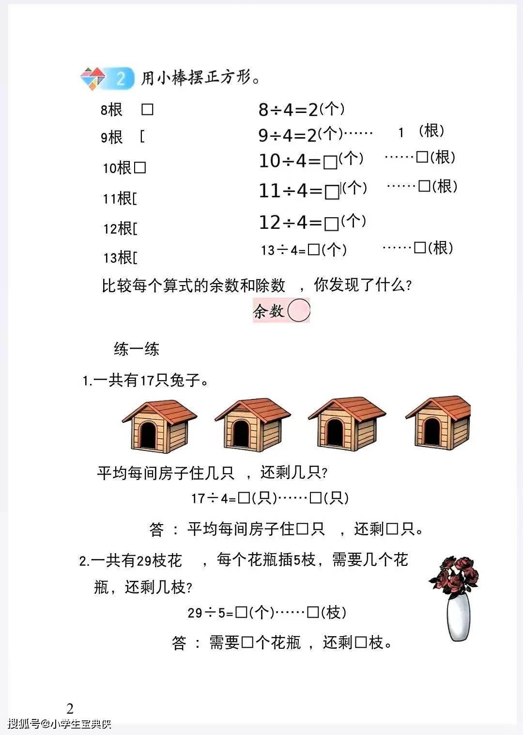在用小棒摆正方形的实践活动中,课本把抽象的数学原理变得直观可感。8 根小棒正好摆 2 个正方形,9 根摆 2 个还剩 1 根,10 根摆 2 个剩 2 根…… 孩子在动手操作中会自己发现:余数总是比除数小。这个核心知识点不再是死记硬背的公式,而是孩子亲手探索出来的规律。这种 “做中学” 的设计,能有效培养孩子的探究能力和逻辑思维。