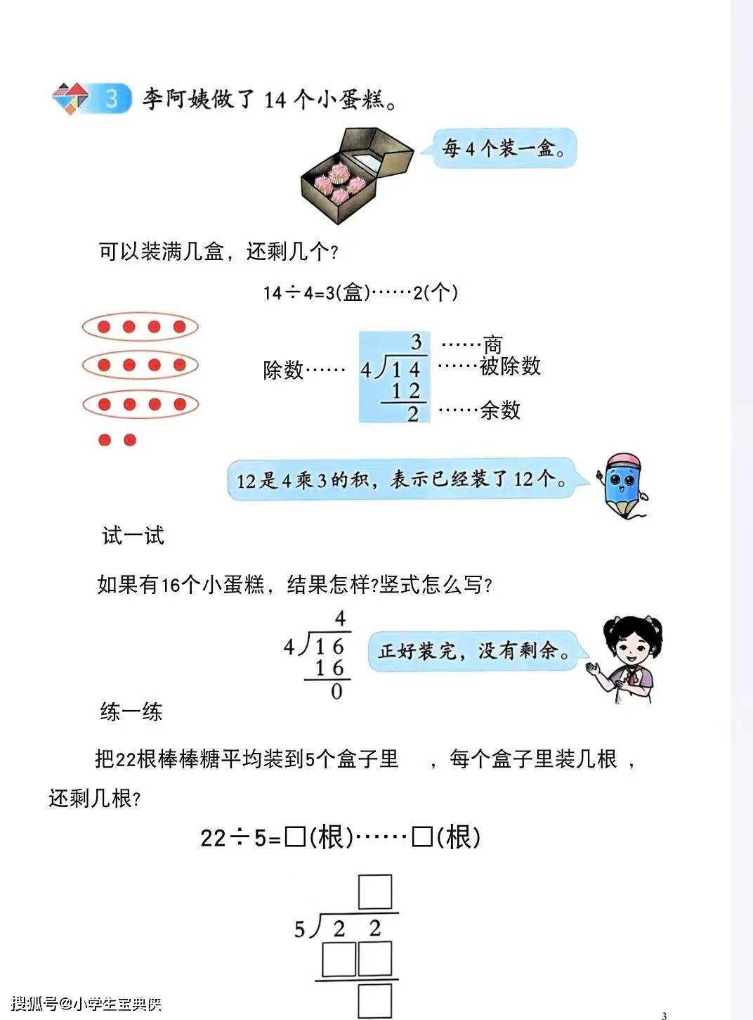 更值得一提的是,课本里的练习题都紧密结合生活场景。17 只兔子住 4 间房子、29 枝花插花瓶、李阿姨做的小蛋糕装盒,这些题目让孩子感受到数学就在身边,学会用数学思维解决实际问题。竖式除法的教学也融入了具体情境,比如 14 个小蛋糕装盒的例子,让孩子理解每一步计算的实际意义,而不是机械地套算。