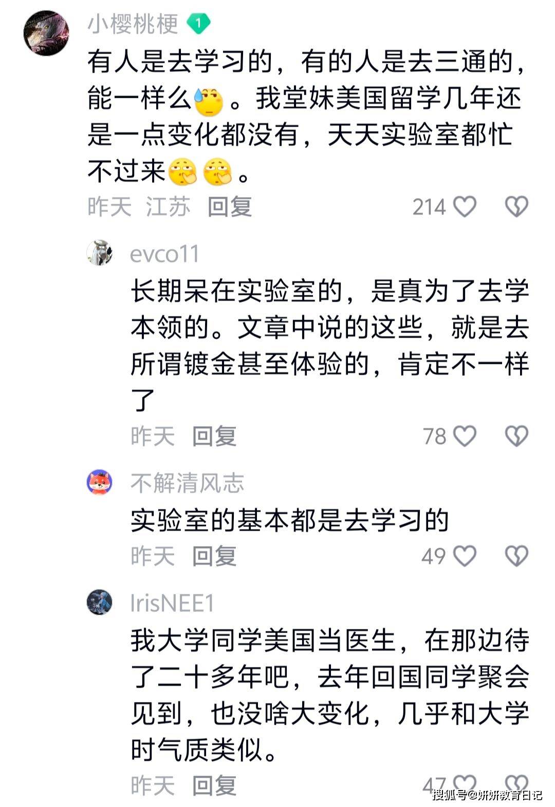 有人说自己的堂妹在美国留学几年还是一点变化都没有,因为人家天天在实验室里忙得不可开交,有人是去学习的,有人则是去进行所谓的三通一达的。