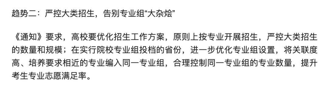 当然,高考录取“超短裙”现象将消失,2026年教育部明确指出严控大类招生,告别专业组“大杂烩”,这样就会从根源上解决“超短裙”招生现象,提升考生专业志愿满足率,个人觉得这种变化是好事,这样首先“大杂烩”招生将被严控,其次专业组会更加准确,避免不相关专业“混搭”,另外,降低了考生被调剂到冷门专业或不喜欢专业的风险,这样高考生更容易被自己喜欢的专业录取,同时高校也能更好培养学生成才。