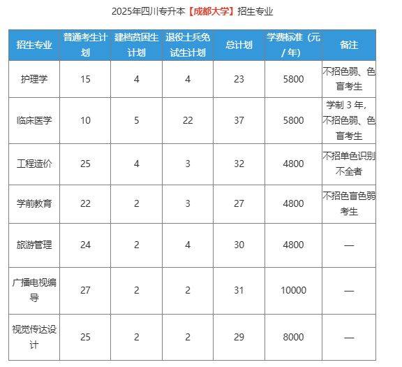 成都大学2025年专升本总计划 210 人,共设置 7 个招生专业。其中,理工农医类包含护理学、临床医学 2 个专业,两者均不招色弱、色盲考生,且临床医学学制为 3 年。