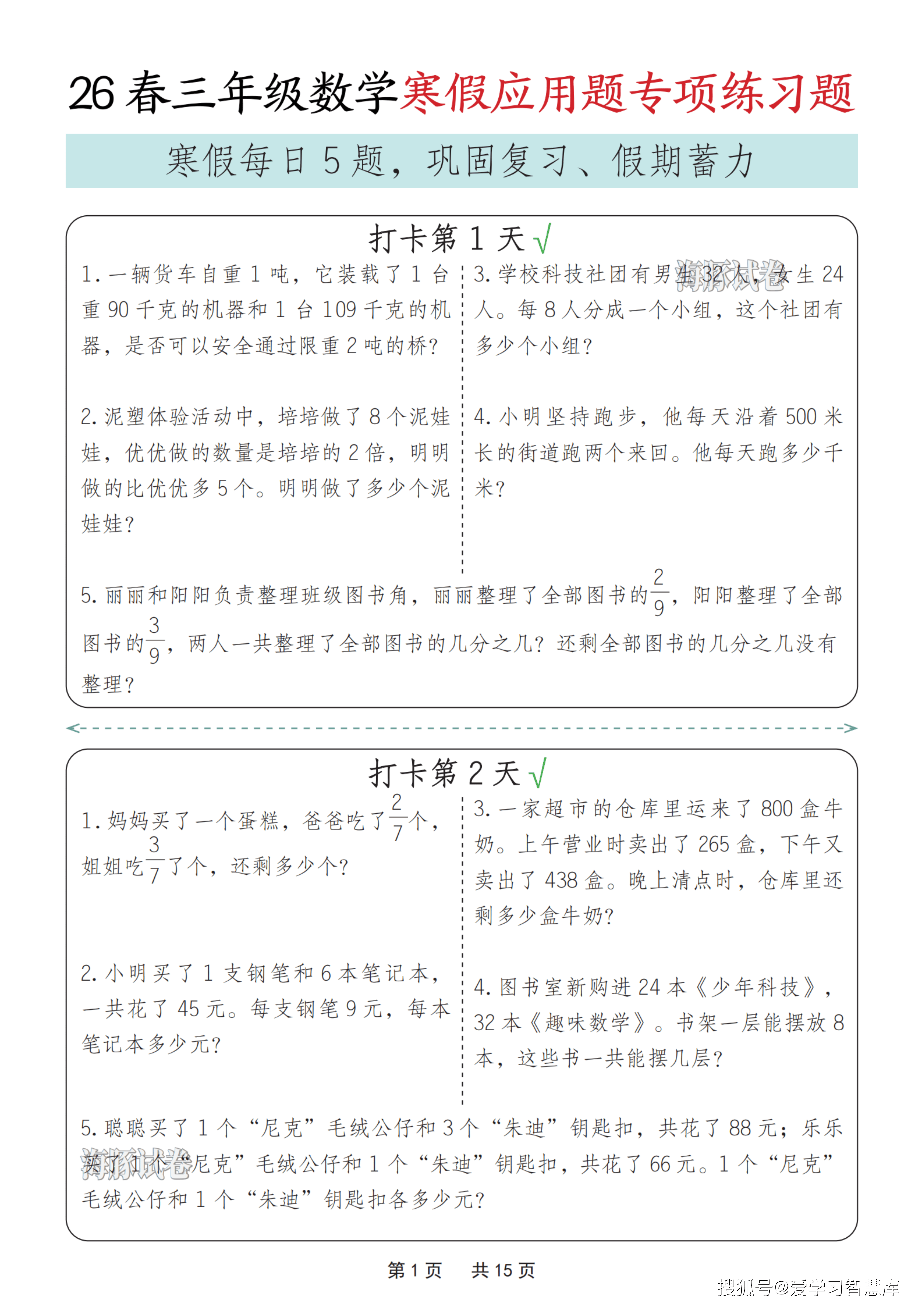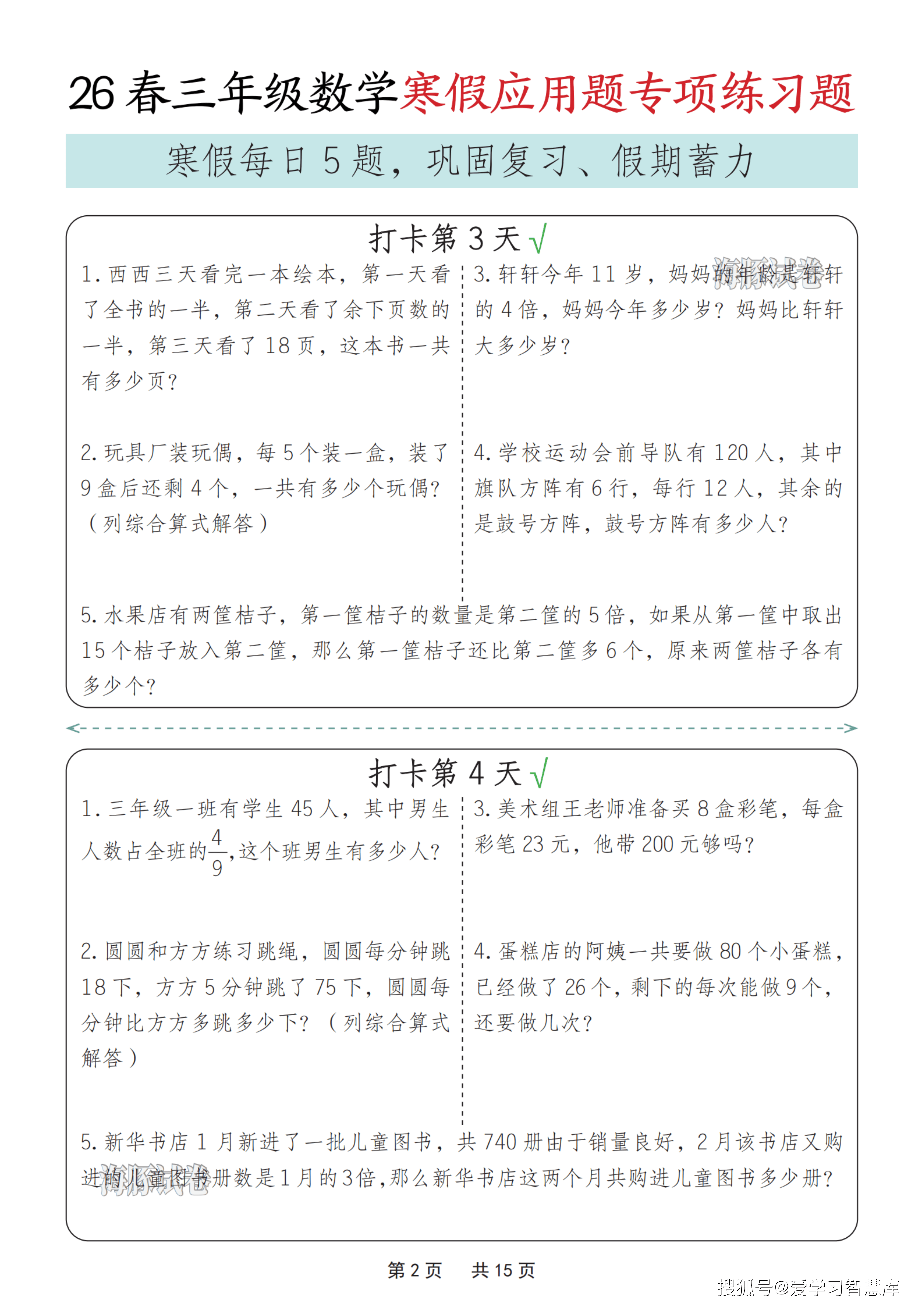 今天给大家分享:对不少人来说,数学应用题是巩固基础、锻炼逻辑的关键板块。每天 5 道题的练习量,既能避免假期知识断层,又能在循序渐进中培养解题思路,让思维保持活跃状态。