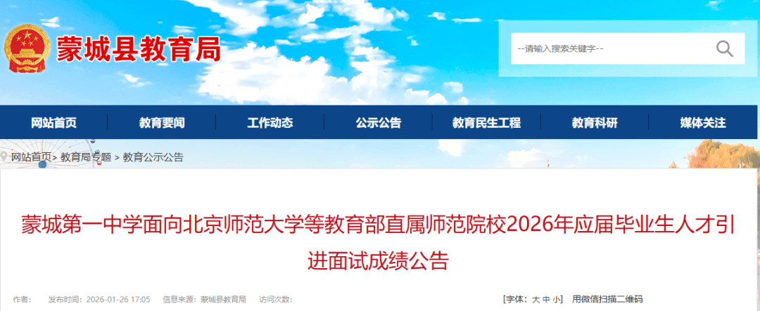 根据《蒙城第一中学面向北京师范大学等教育部直属师范院校2026年应届毕业生人才引进公告》有关要求,现将此次人才引进考生面试成绩予以公布。拟于2026年7月下旬发布体检、考察公告,请各位考生及时关注蒙城县教育局政务公开网。