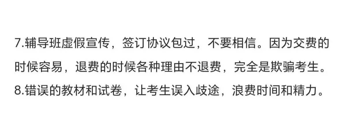 6.不要按照辅导班的教材和试卷复习。因为辅导班的老师都不是大学教授,老师都不是权威的,所以编写的教材和试卷也不是权威的,具有误导性。