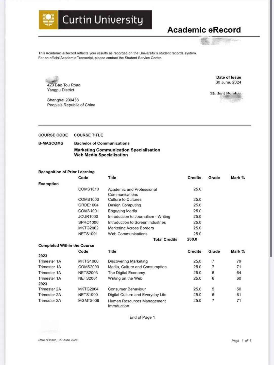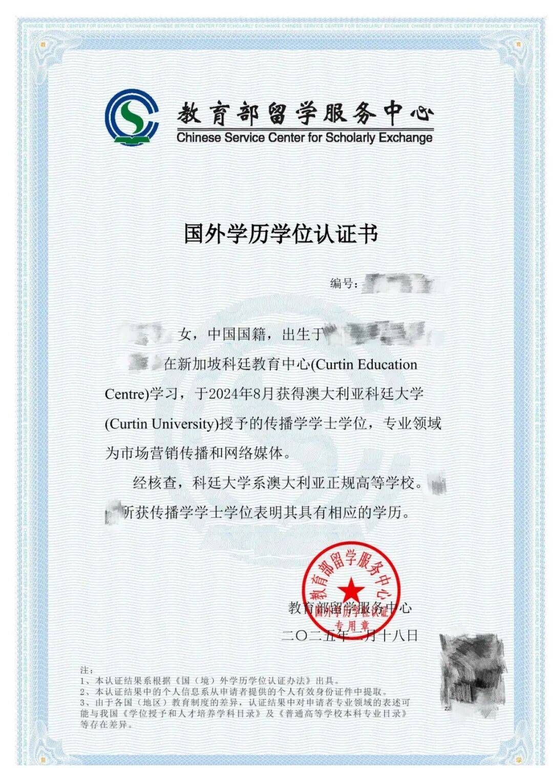 以下是中国教育部留服颁发的科廷新加坡回国认证的样本(科廷新加坡学生的成绩单和学位证等证书都是由澳洲本部出具的,统一显示“科廷大学”,而非科廷新加坡)
